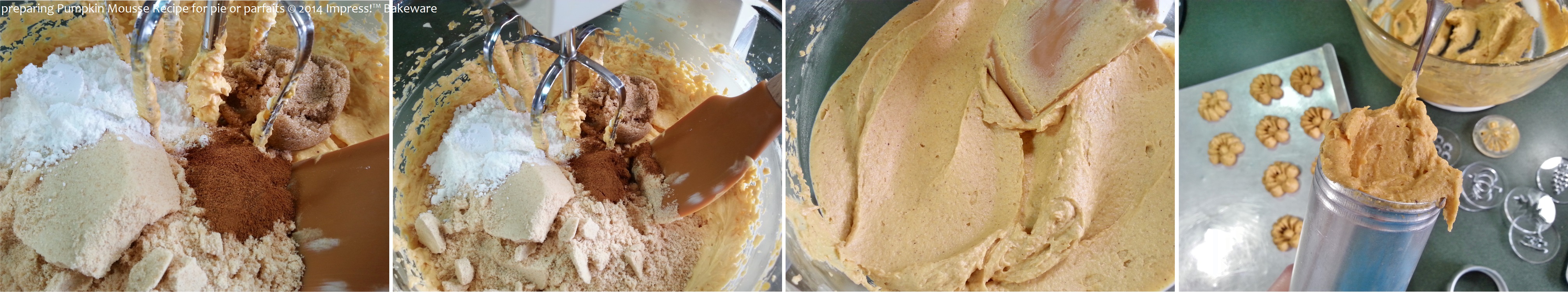 This pumpkin mousse recipe makes a fabulous decoration on top of pumpkin pie, and being pressable with a cookie press, you can choose from a multitude of shapes that suit your holiday theme. The flavor and texture is so close to that of pumpkin pie, the decorative shapes will blend right in and your taste buds will be as happy as your eyes. (See bottom of post for pumpkin mousse parfaits!)