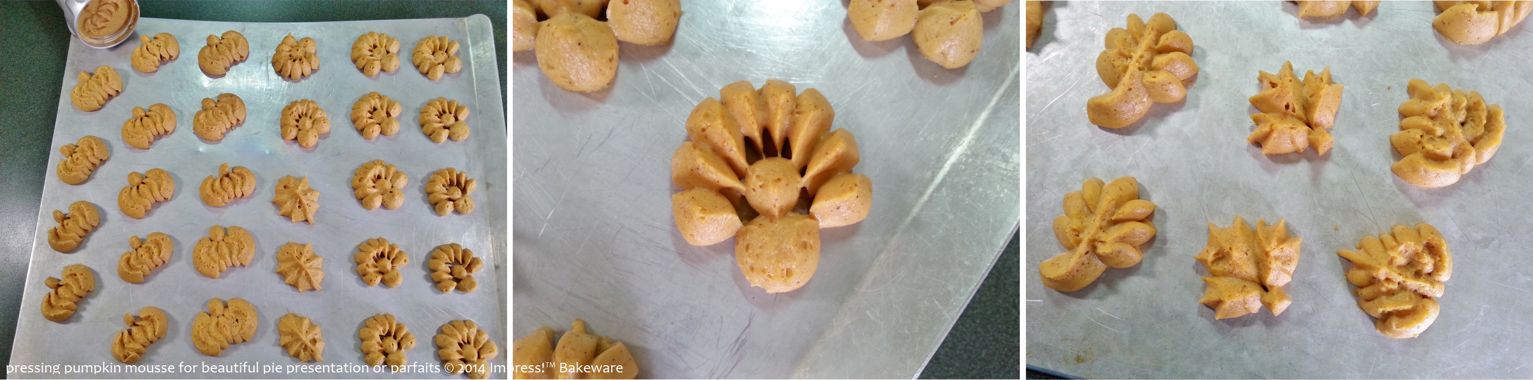 Today I pressed a couple of cookie sheets full of designs using Impress!™ cookie press shapes, some from the Thanksgiving disk set and some from the Leaves & Trees disk set. Once I saw them and played around with different combinations I decided on a Turkey (from the Thanksgiving set) in the pie’s center and Oak Leaves (from the Leaves & Trees set) all around. The other shapes I saved to make parfaits with later.