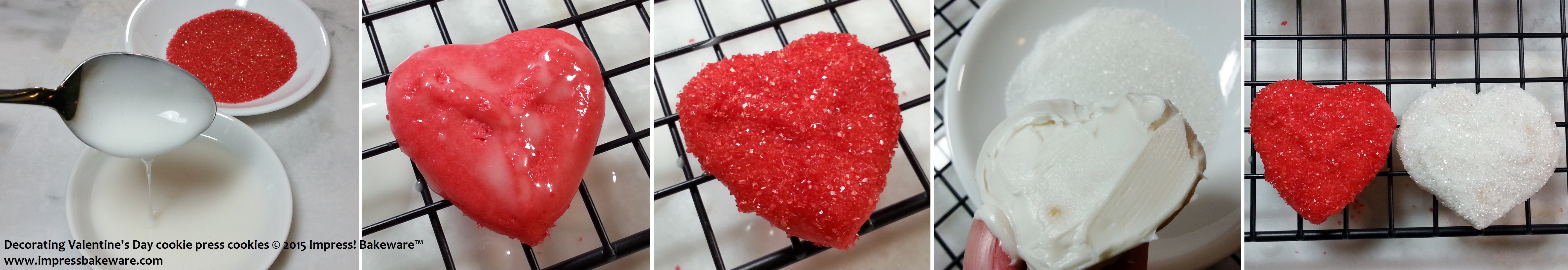 I colored some canned icing (I had a very busy week with two teenagers and a sick dog! No time for homemade icing this week.) in red, pink, and green, again with gel food dye to avoid thinning the icing. I also made a very small bowl of confectioner’s glaze, simply combining powdered sugar and a little water until I had a very runny, thin mixture. Using a spoon and my fingers, I coated some heart cookies in the glaze, then turned them upside-down in colored sanding sugars, pressing gently in to coat the entire cookie top. I frosted the white cookie with the canned frosting as it made a better white background for white sugars.