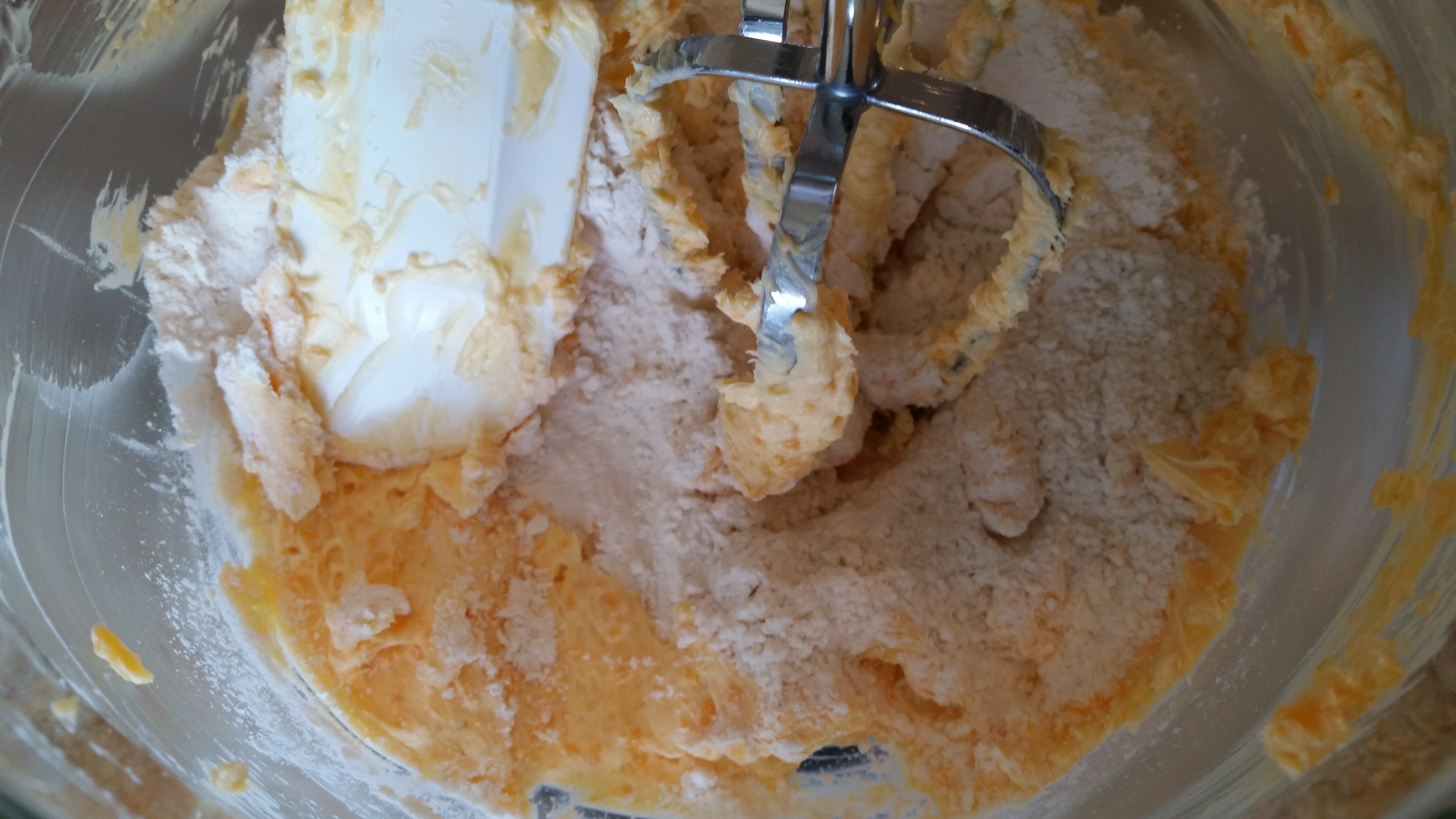 Add the grated cheese to the creamed butter. Cream it until the mixture turns light orange with just small bits of solid cheese remaining.