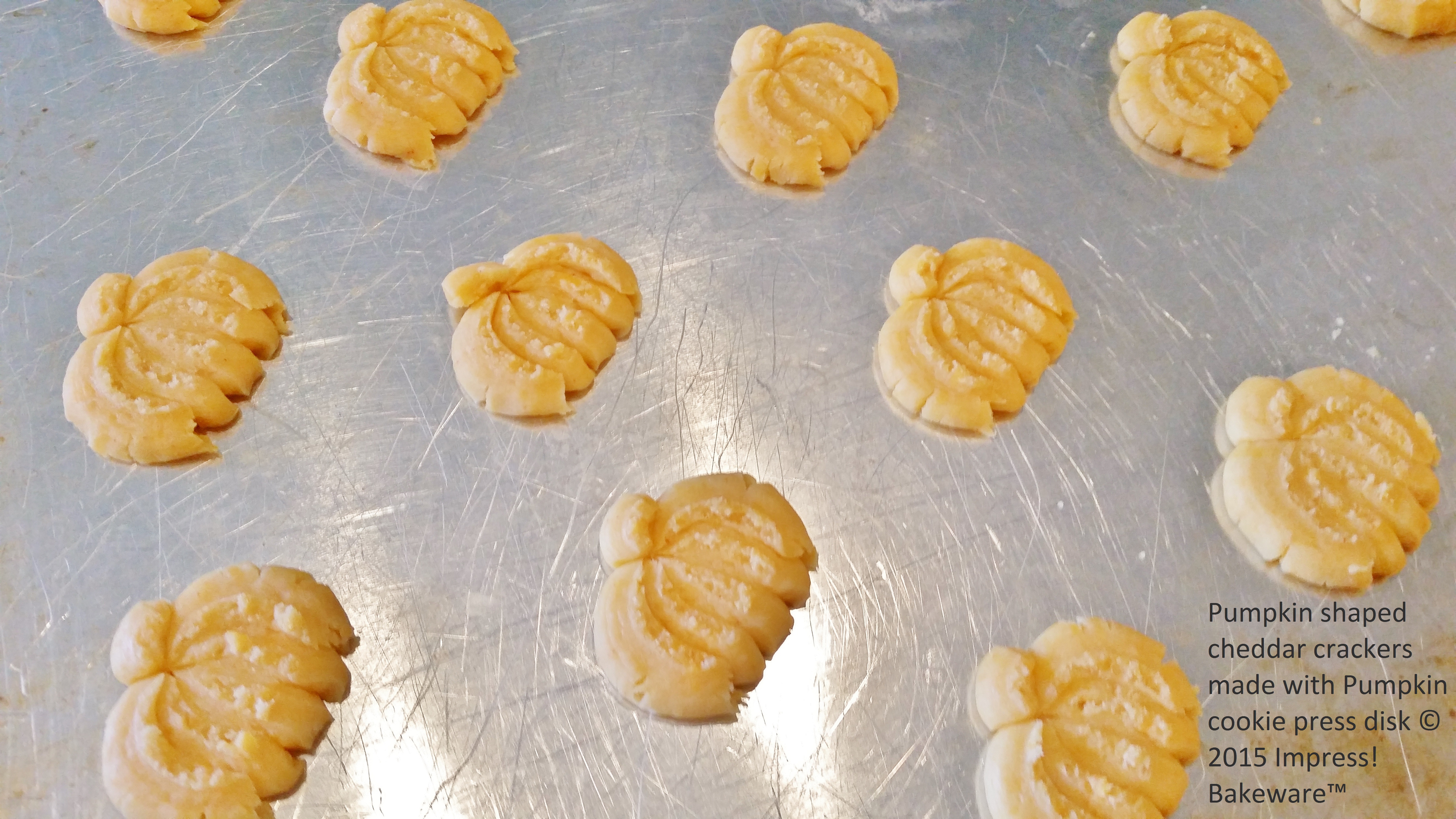 Pumpkin shaped cheddar cheese crackers made with a cookie press.