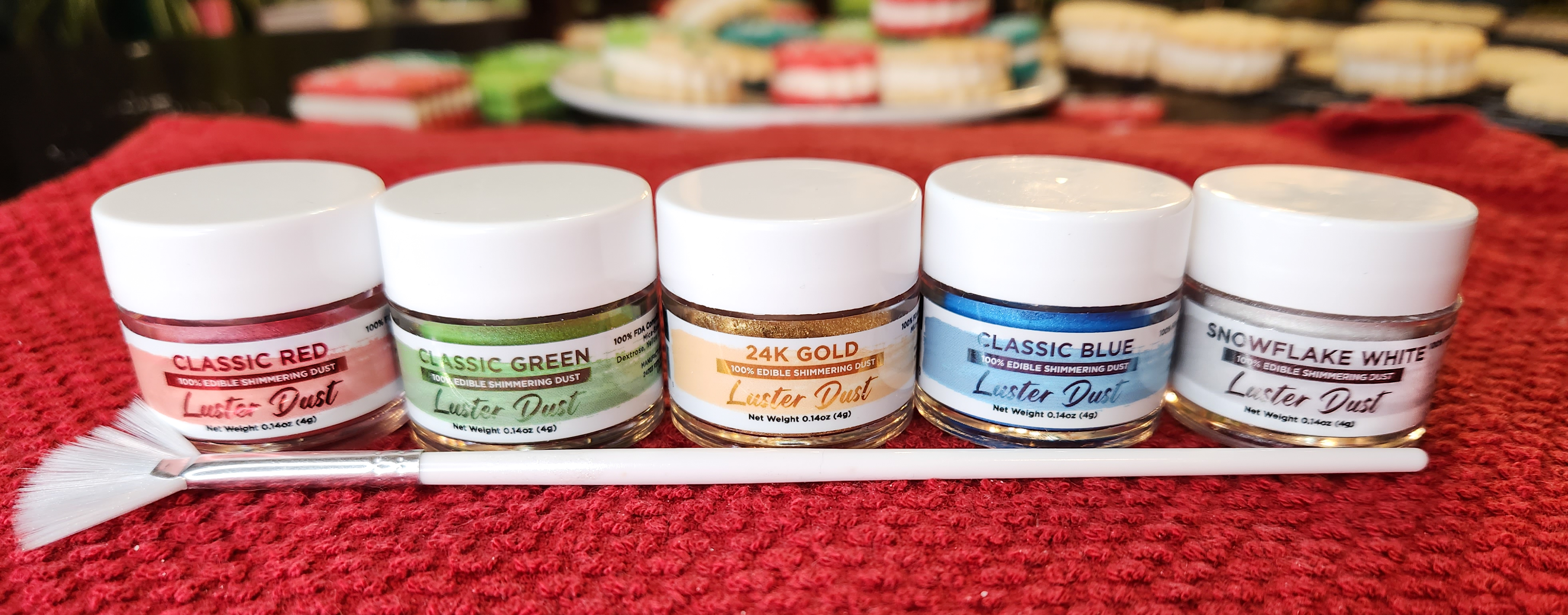 2023 NOTE: Luster dust is what makes this beautiful presentation possible. I use it so often in my cookie press posts that this year (2022) we’ve started selling it on our website and Etsy shop! We chose to partner with an American company, Bakell, that makes dusts here in the USA. They make gorgeous dusts that are silky, vibrant, and a joy to work with. Their 4 gram jars last and last. A little goes a long way!