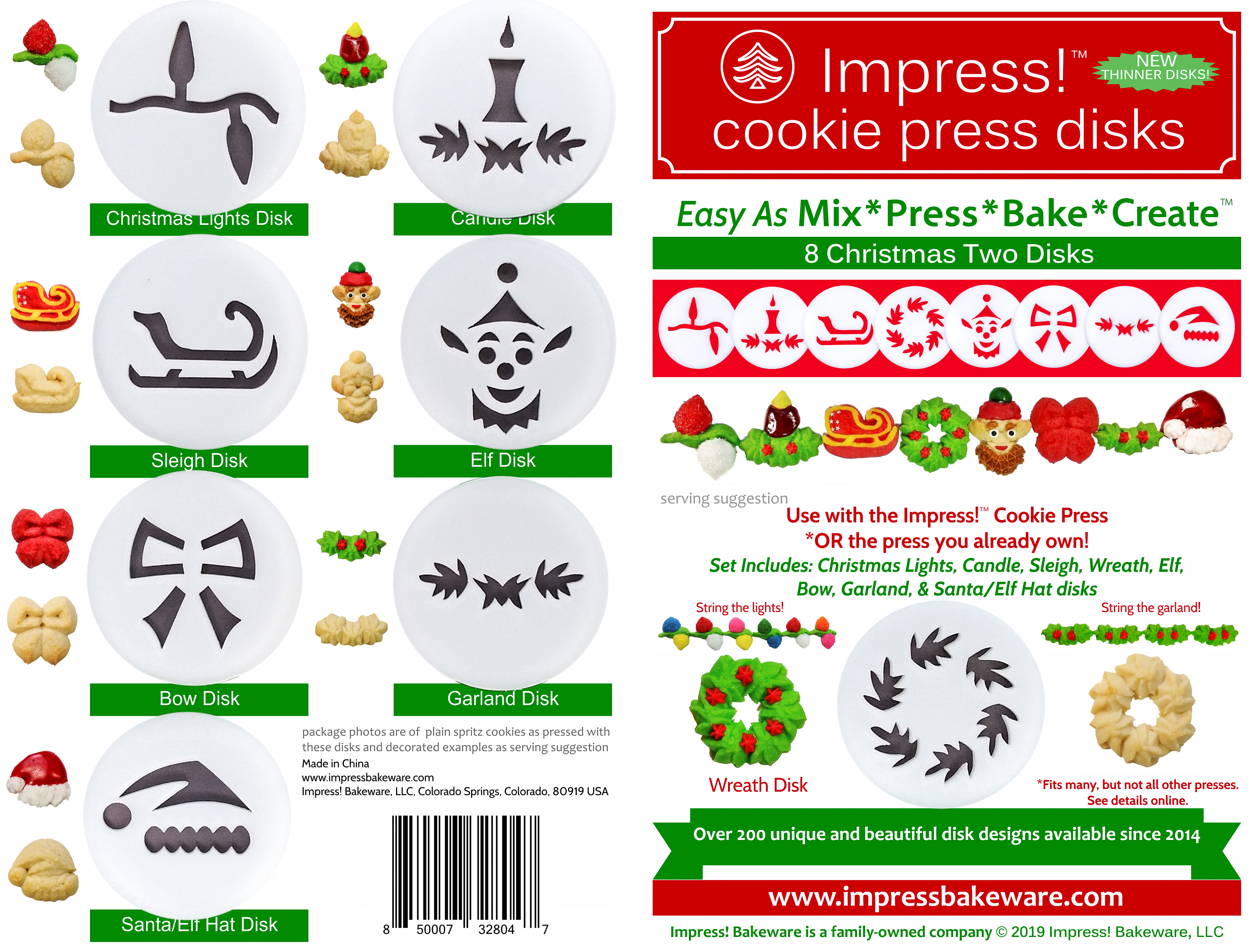 Our website has all of our 200+ disk shapes, cookie press, embossed rolling pins, stamps, luster dusts, baking accessories plus more about our Women/Family Owned company! impressbakeware.com