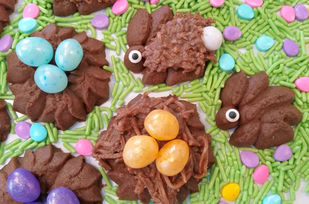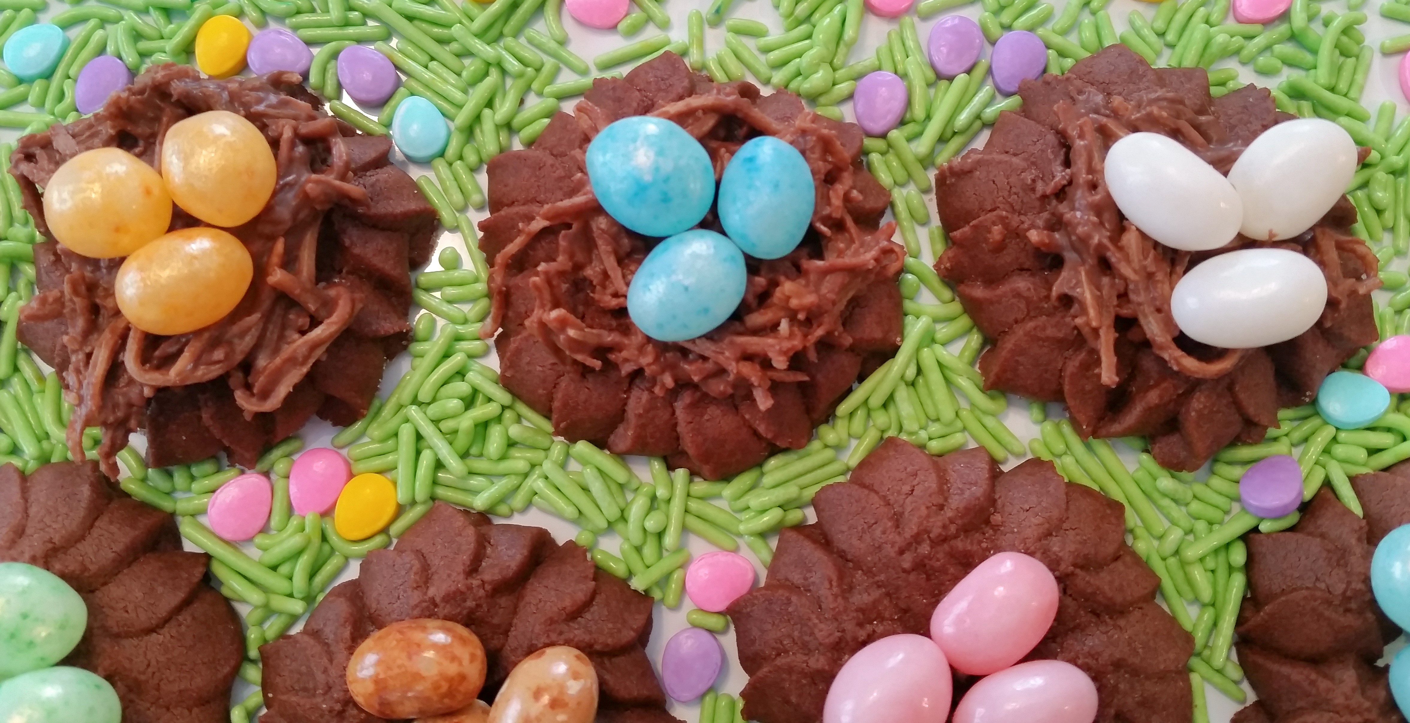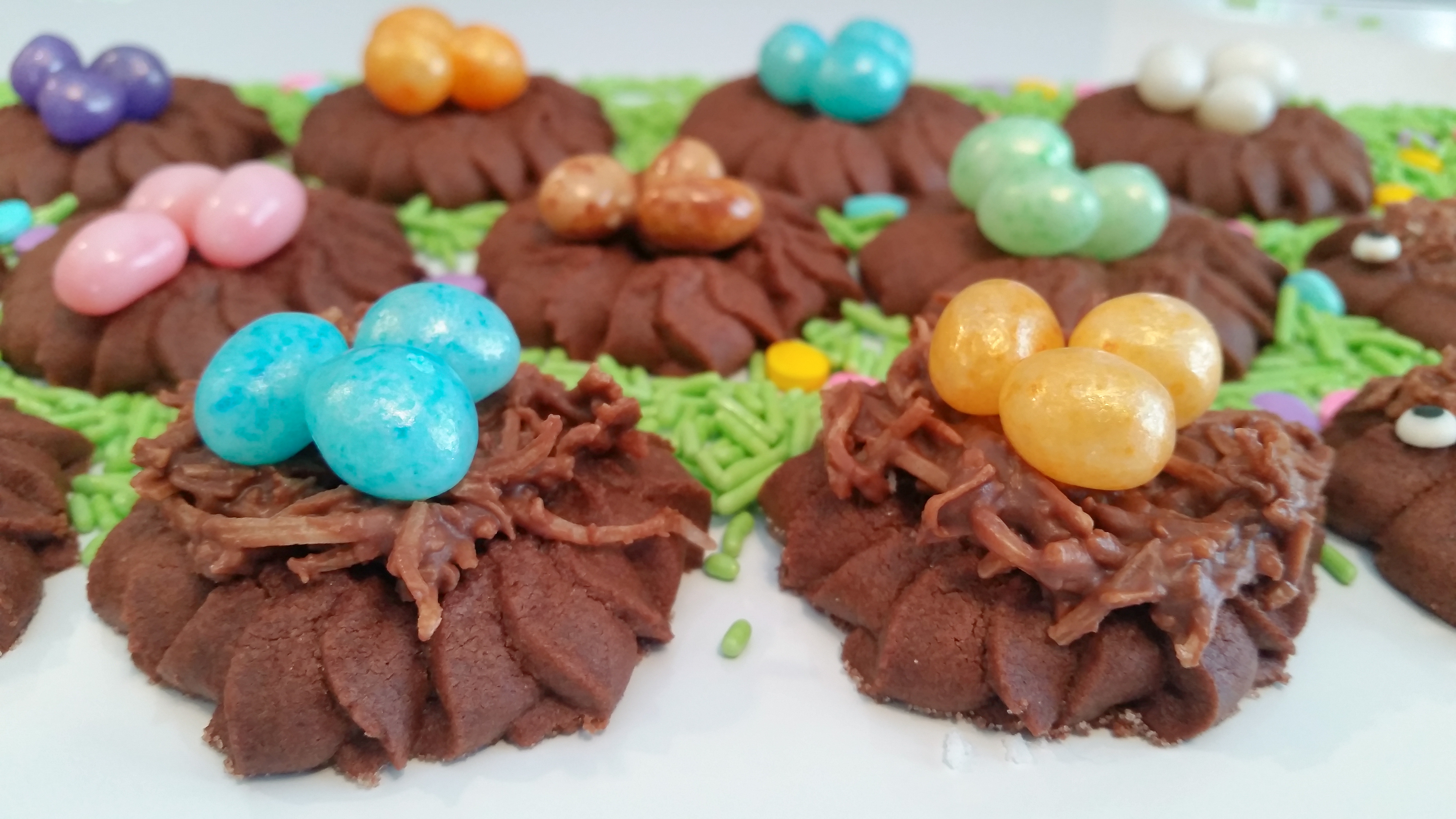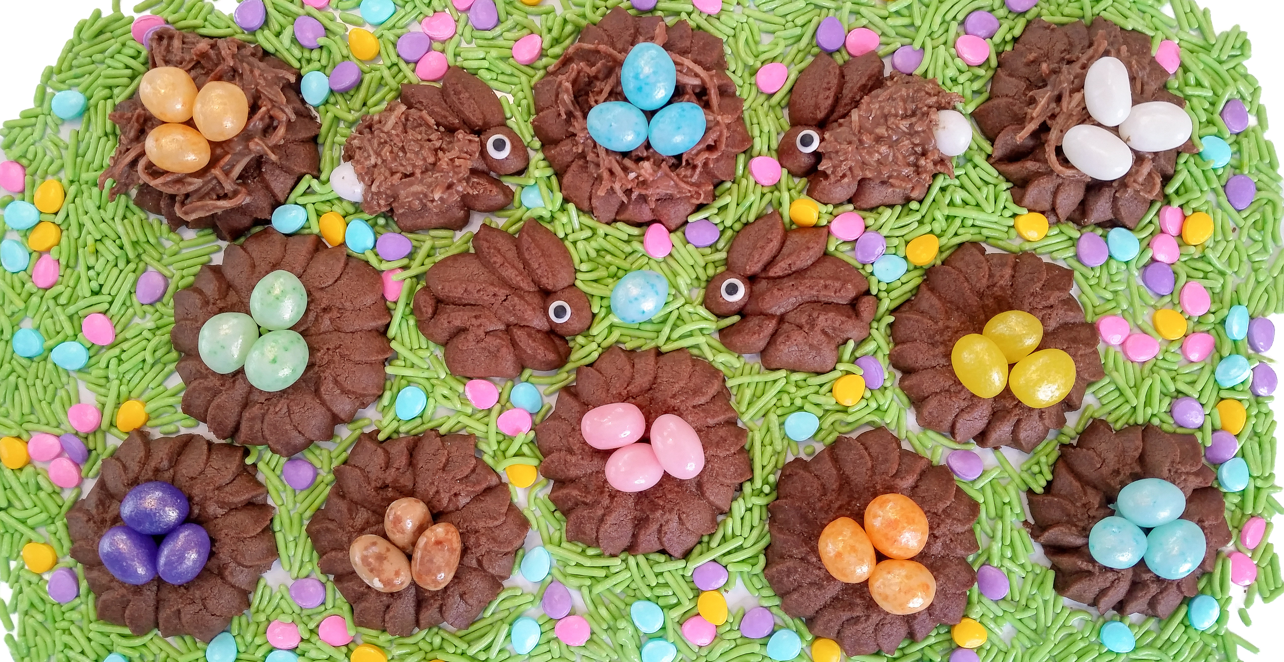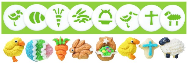 I love it when our disk shapes can be used in a new way! Here’s our Wreath shape from the Christmas Two Disk Set doubling as bird’s nests for Easter! Bake these up in chocolate spritz dough with some bunnies from the Easter Disk Set, with optional chocolate-drenched coconut for “fur” and “twigs”.