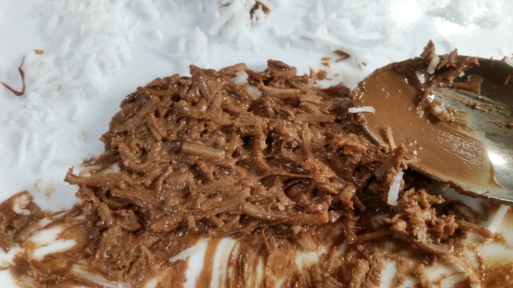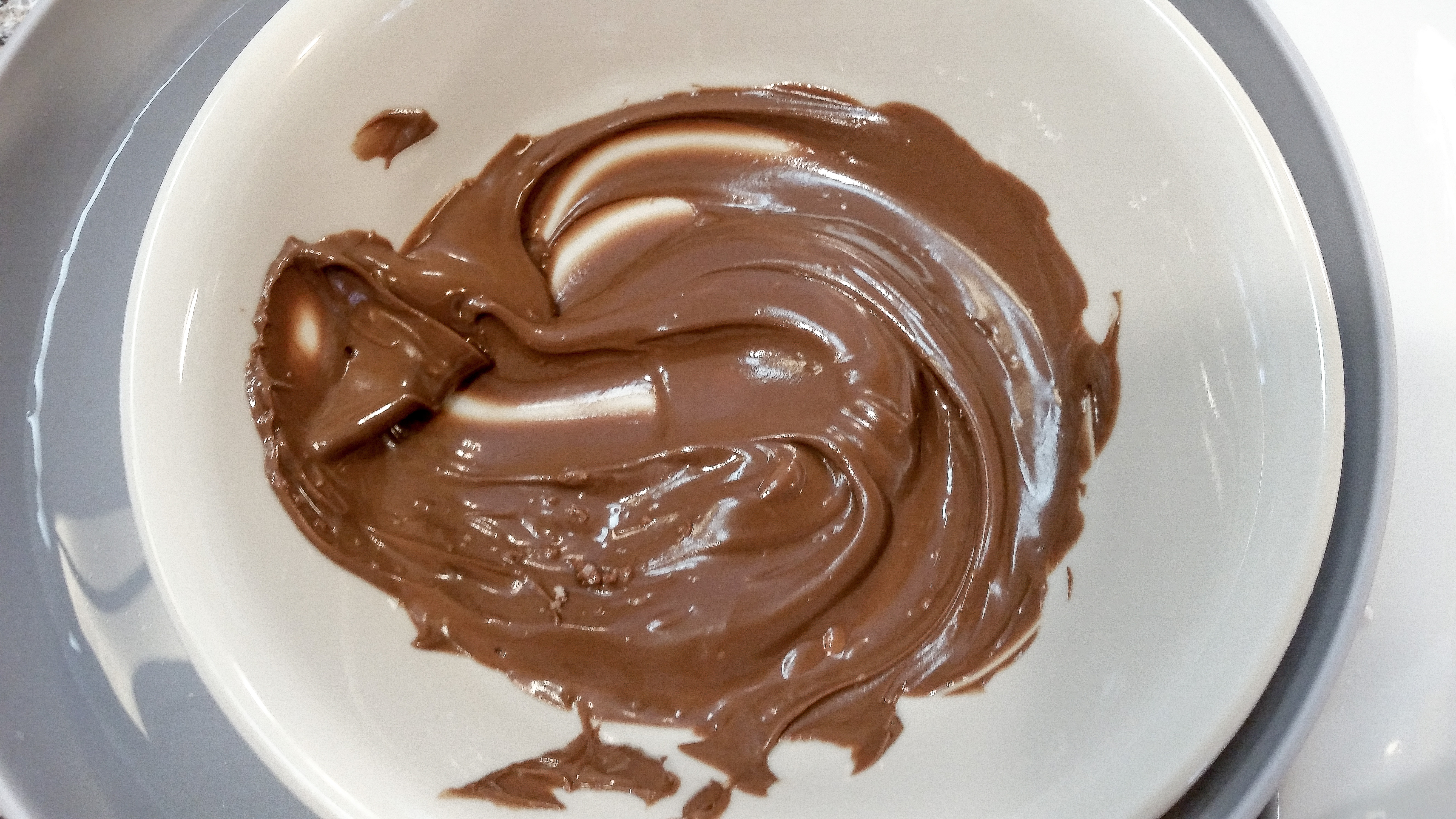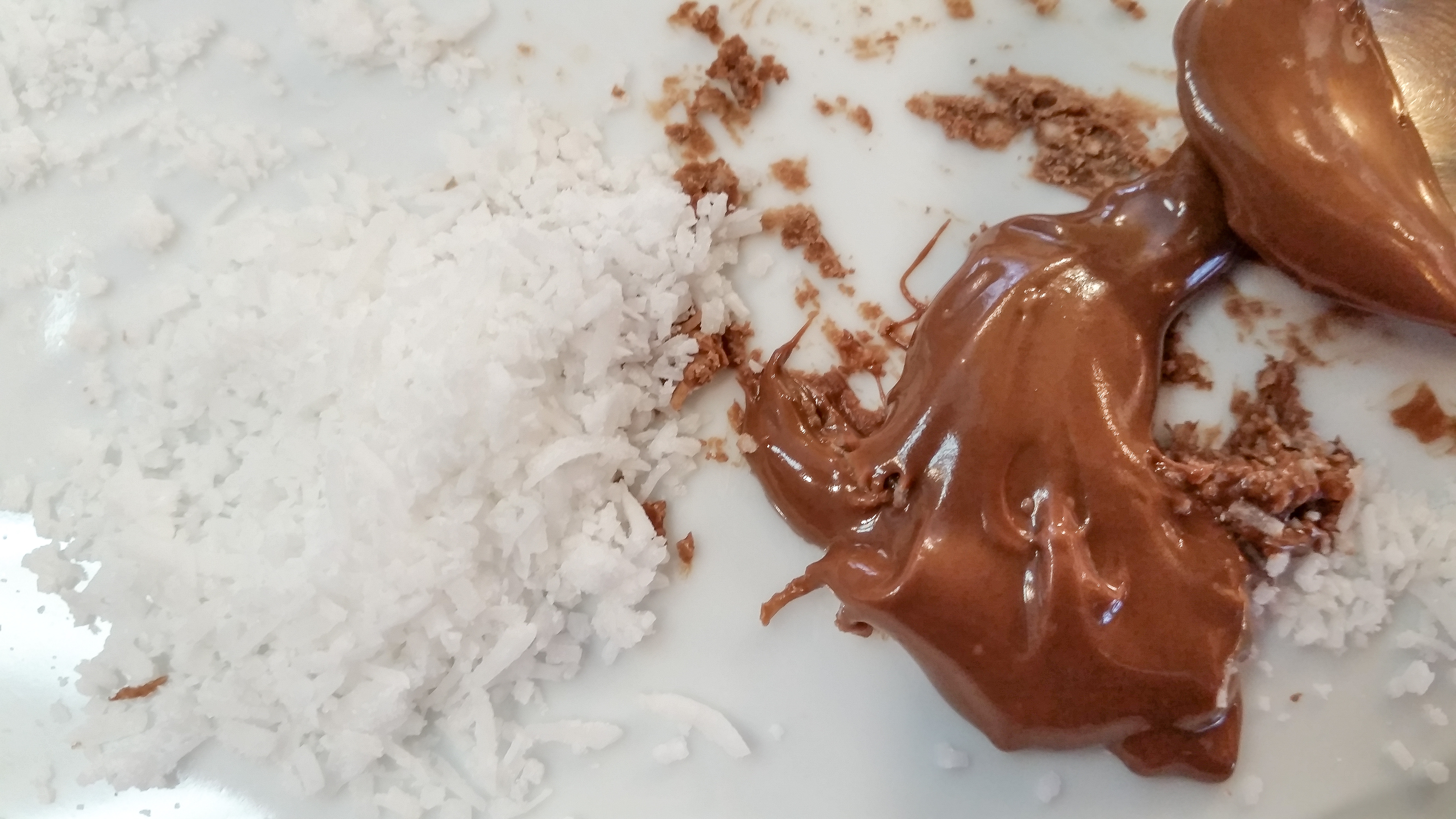 While the cookies are cooling, set up to drench your coconut in chocolate. You’re going to want to work in small batches because the chocolate will start to harden once you mix it with the coconut.