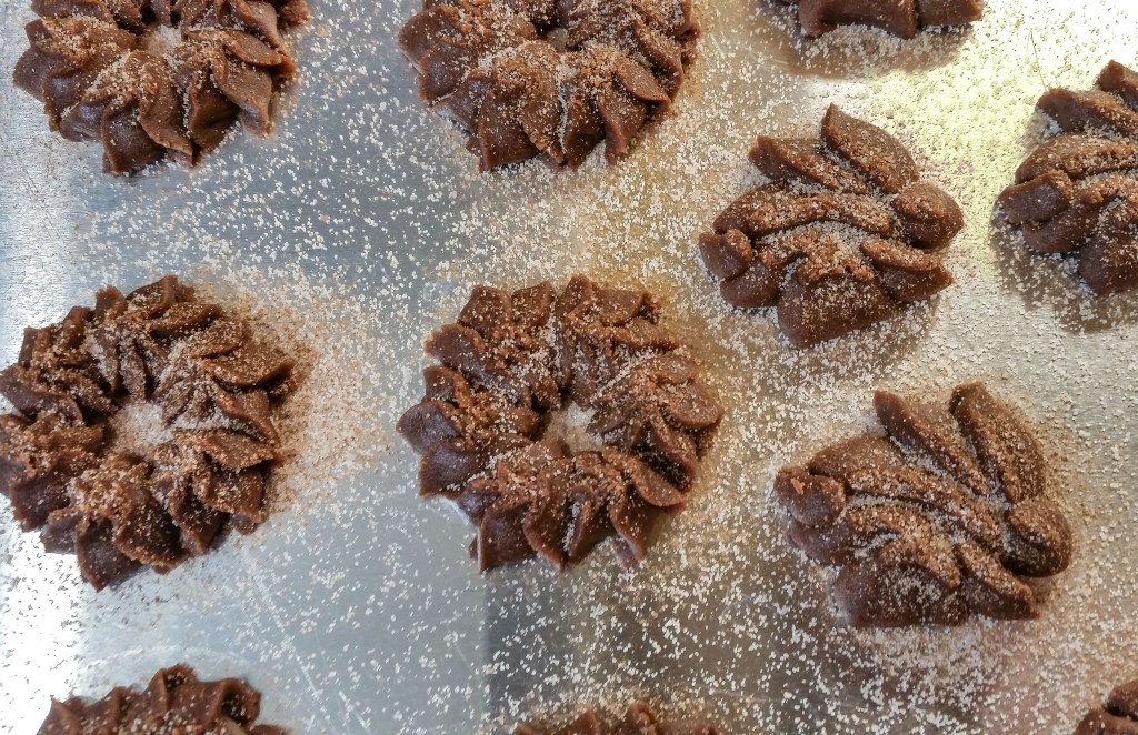 I added a touch of sprinkled sugar to mine. Use a mesh spoon or regular spoon to tap plain granulated sugar onto the tops of the pressed cookies. I actually combined a little granulated sugar with some unsweetened cocoa- about even amounts- and sprinkled that on top to add some sweetness. These cookies are not overly sweet on their own. They’re more like a rich chocolate flavor. So if you want sweet, sprinkle away!