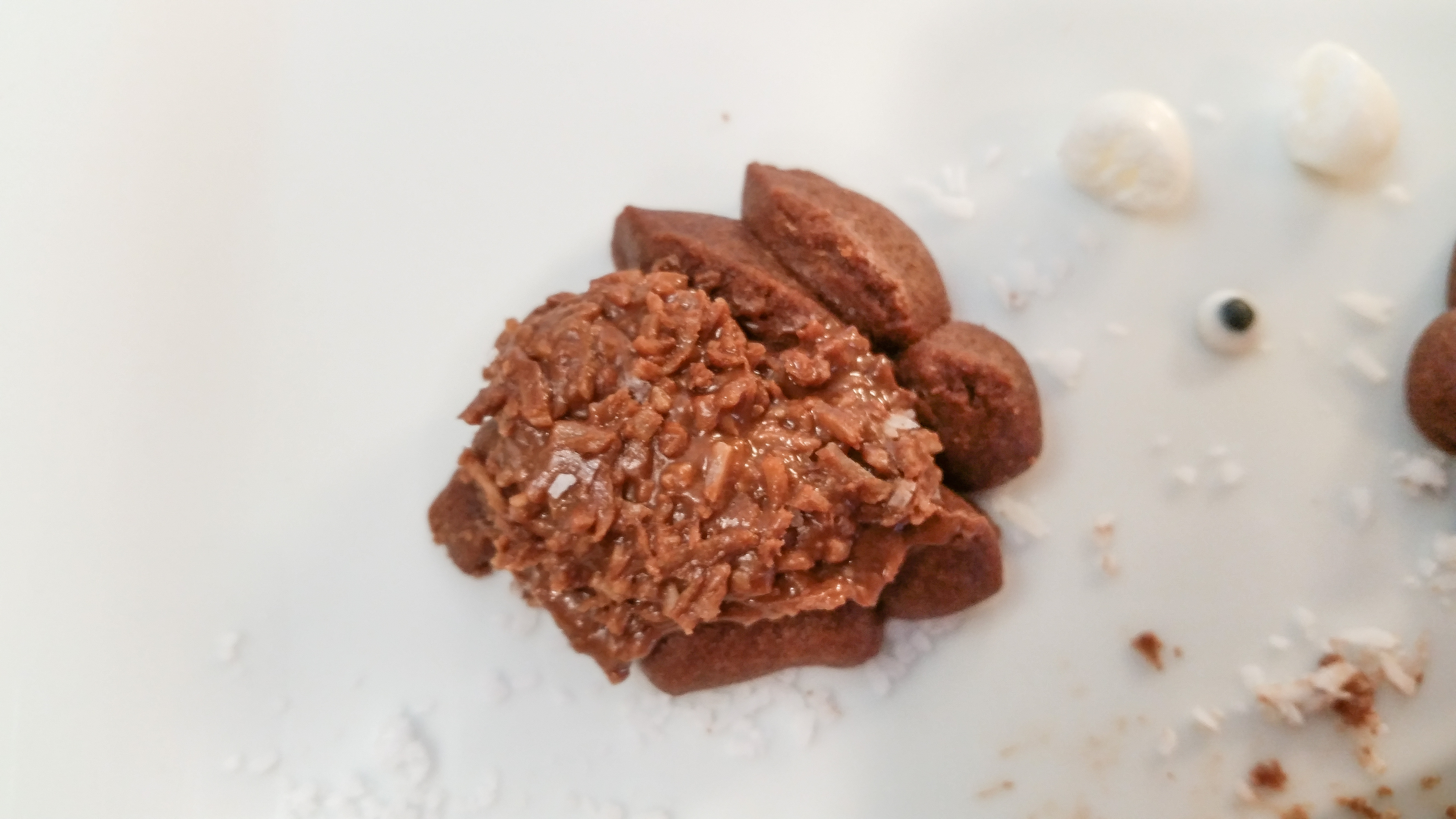Work on a small plate or waxed paper or a silicone mat. Place a few tablespoons of coconut on the plate next to a tablespoon or so of chocolate. Mix it up with a spoon, kind of smooshing the coconut into the chocolate, until it’s all coated. Add more of either to get a consistency you like! I found that more drippy chocolate was good for the long strands of coconut for the nests, and higher portion of coconut made it “furrier” for the bunnies. Experiment!
