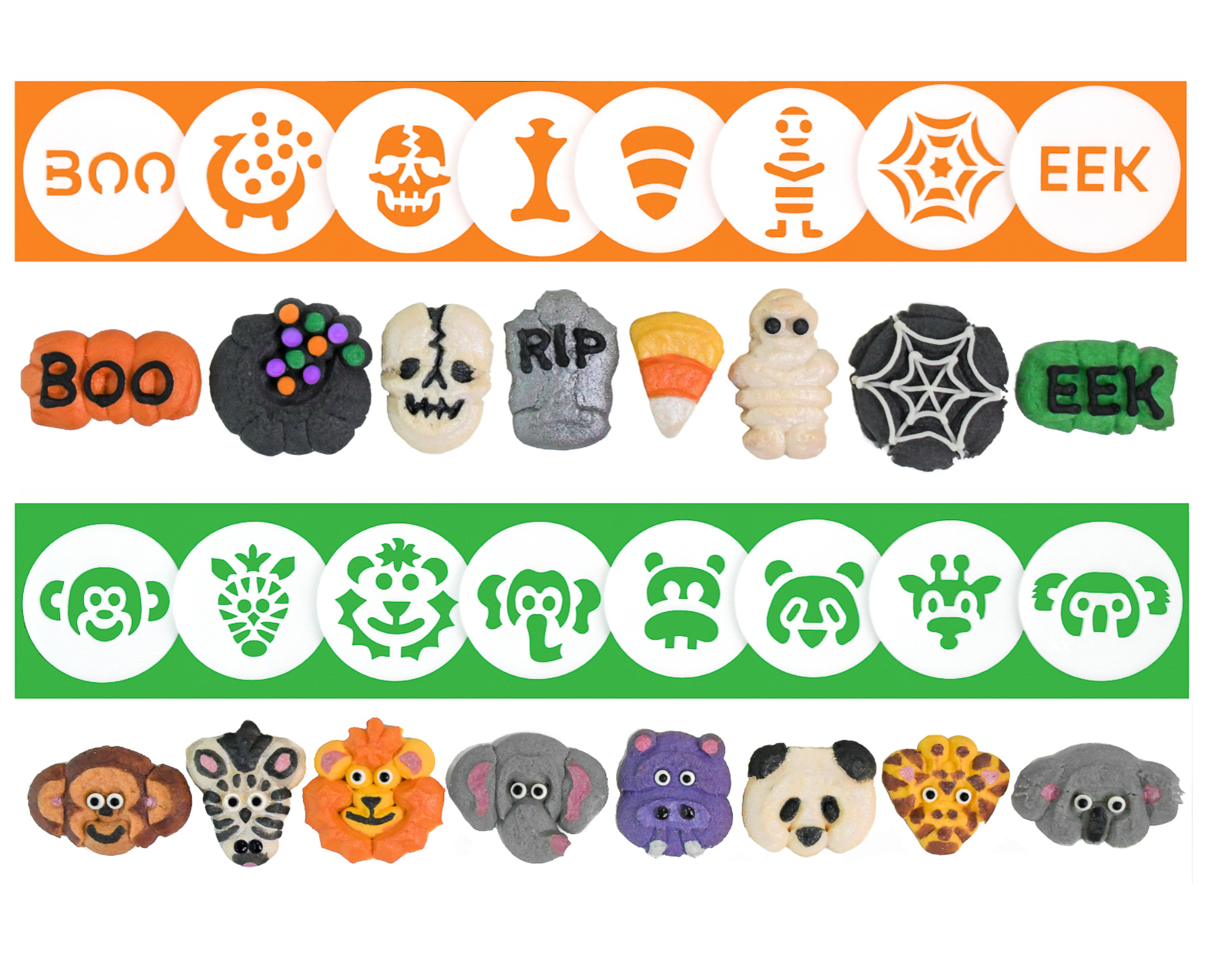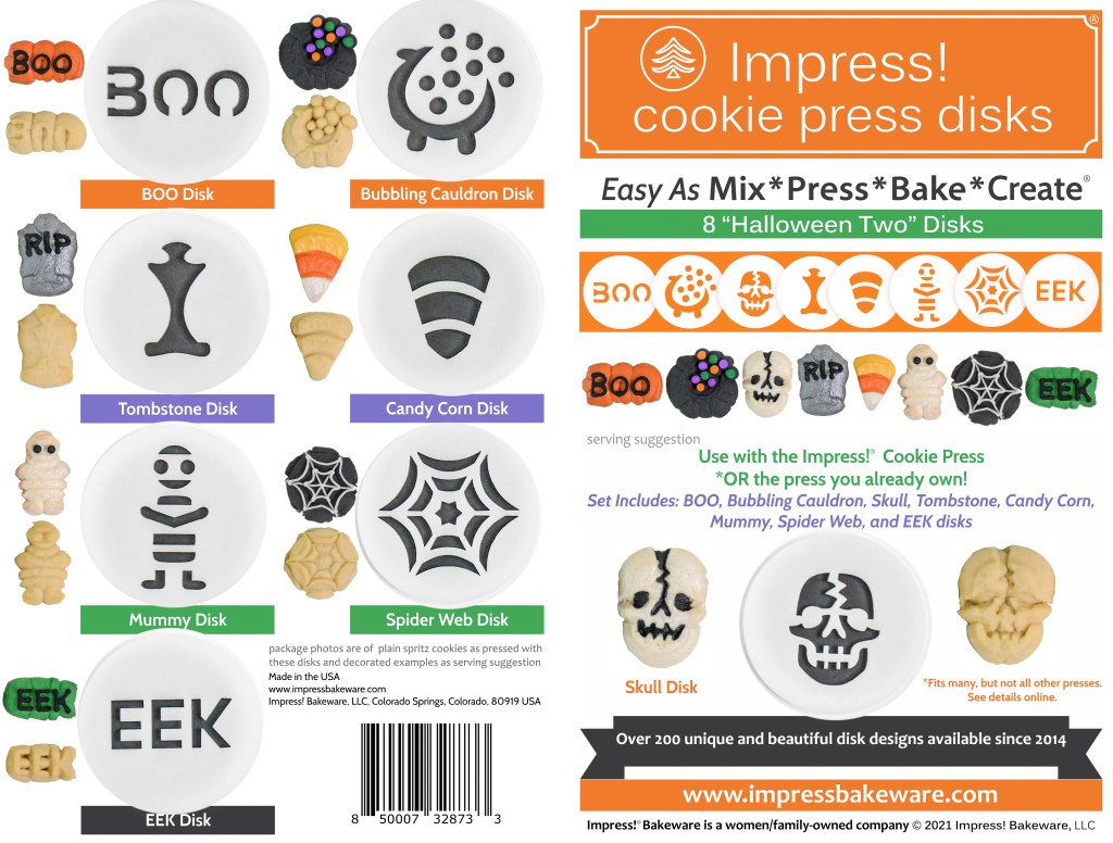 Introducing Halloween TWO & ZOO Animals Disk sets! To celebrate, our Labor Day Sale is going on now through September 8th! 15% off all disk sets & our cookie press. Discount shows in cart. List of presses we fit on website. Offer available only on our www.impressbakeware.com/ website.