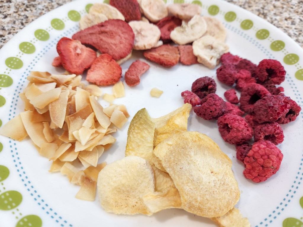To this dough add about 1 cup (measured once pulverized) of freeze-dried fruits! Honestly pick any one or 2 or 6 you like. I tried a bunch of combinations and they were all good. Just a nice, fruity sweetness comes through. In the cookies shown in the photo I blended pulverized toasted coconut chips, raspberries, strawberries, bananas, and peaches. Great blend! Use a food processor/blender/magic bullet type appliance to make the fruits VERY finely ground, almost the consistency of powder.