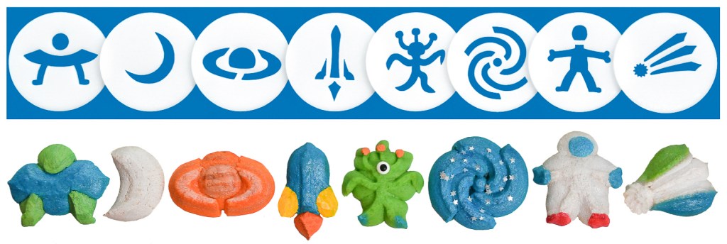 When we first launched Impress! Bakeware in 2014 we had an outer space set. It was retired when we re-opened in 2019 as it wasn’t quite as good as we had hoped. I listened to people’s comments over the years and reimagined the set, adding 5 new shapes, giving the remaining 3 a retouch, and giving the set a whole new look. Both my and (my business partner/sister-in-law) Jill’s daughters majored/minored in Astronomy in college so we are all huge space fans! For this fun set I made colorful confetti spritz cookies.