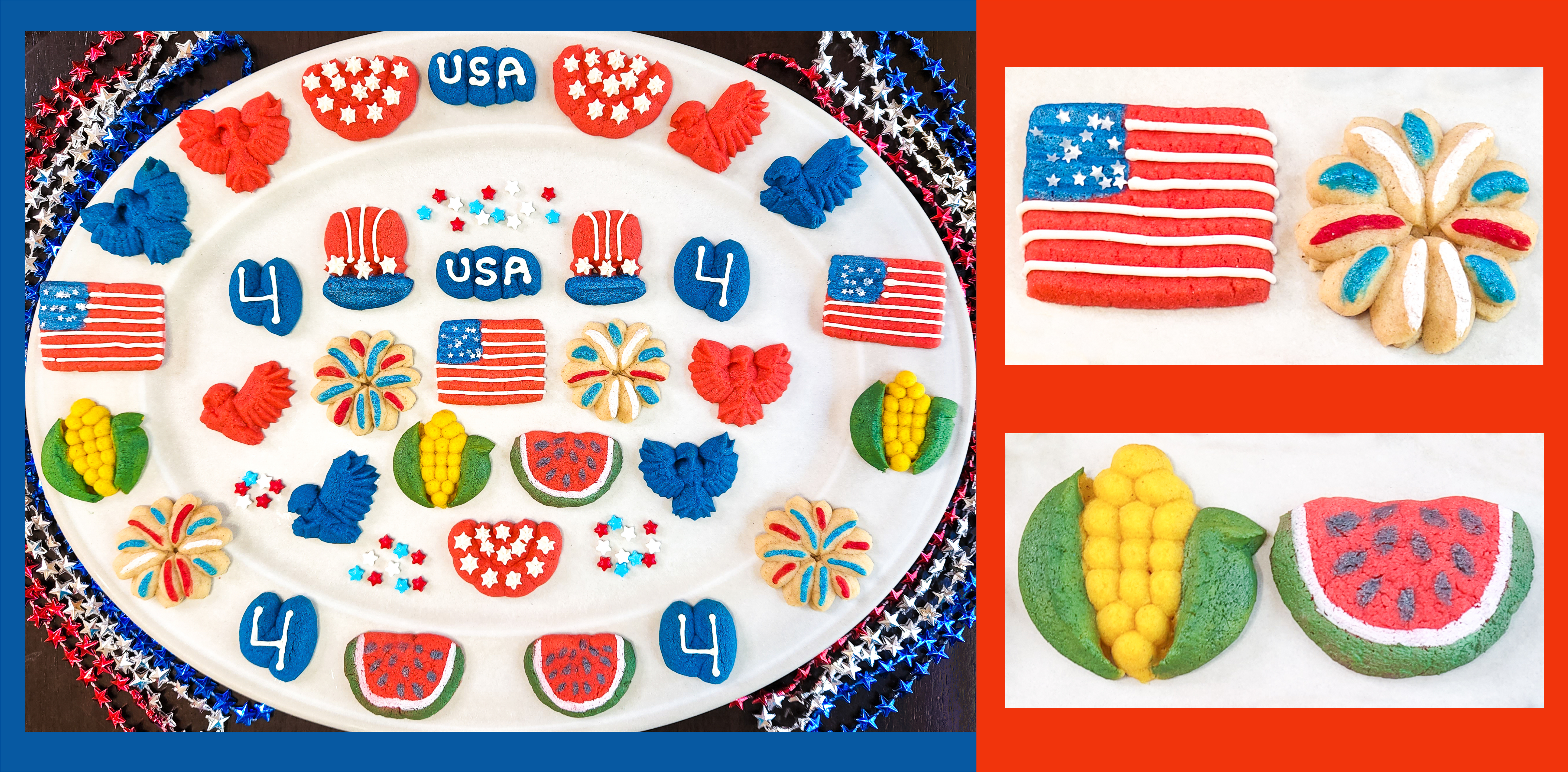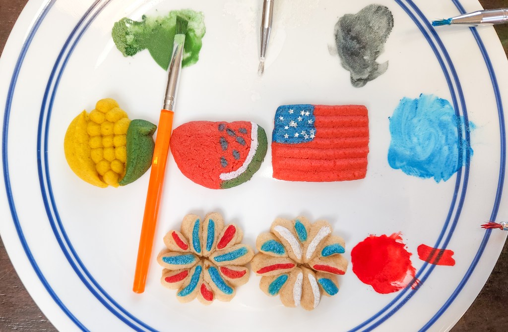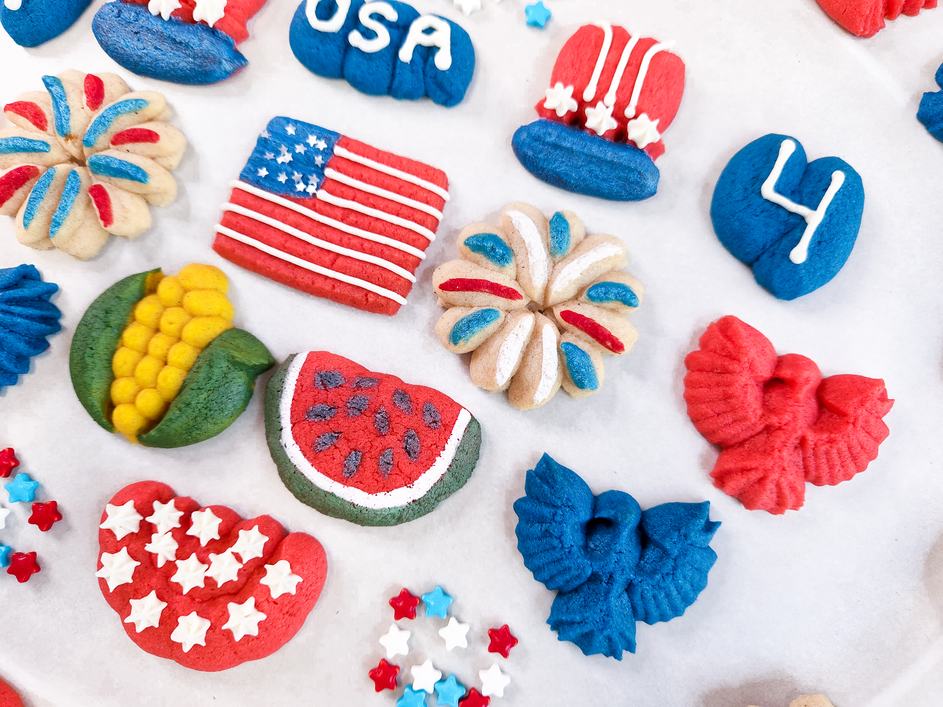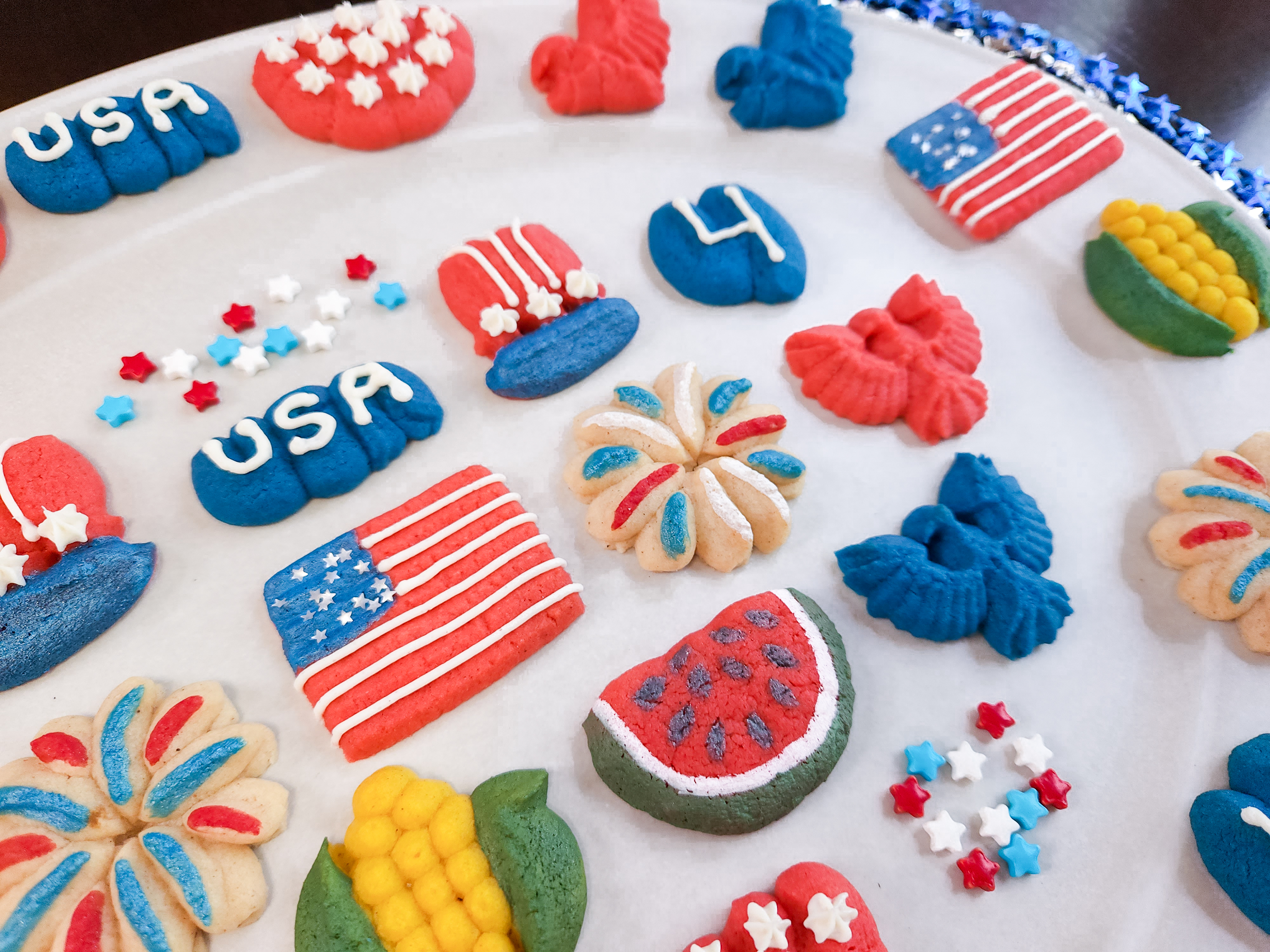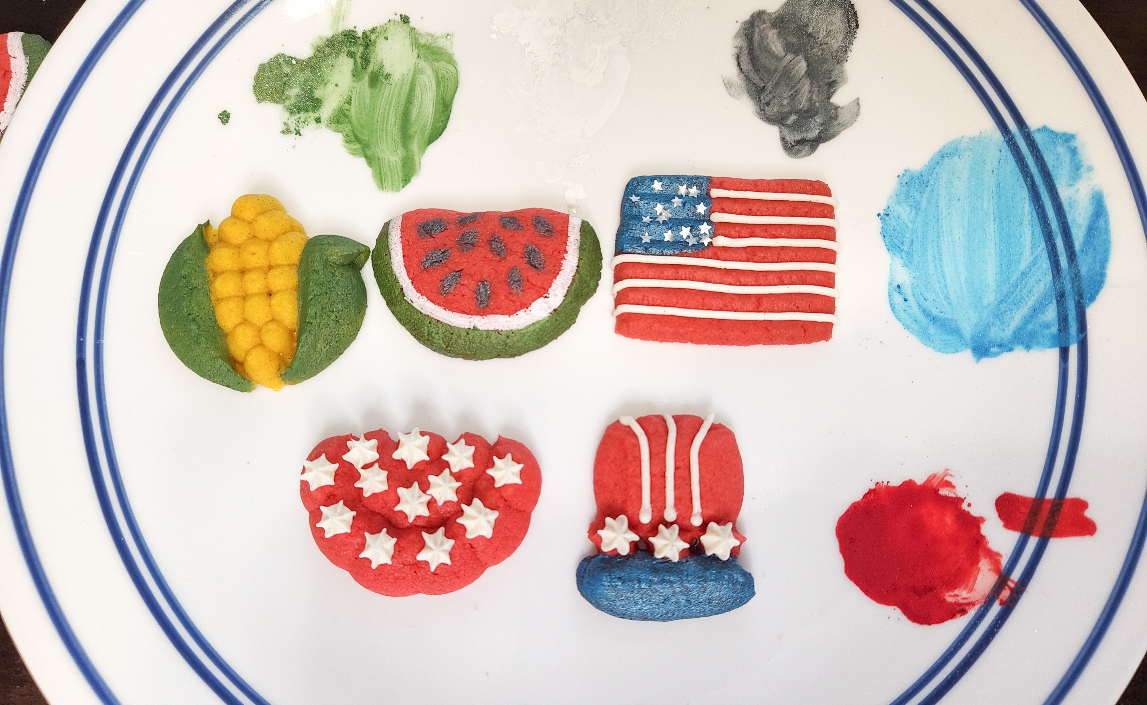 This pretty plateful of cookies looks deceptively complicated. It was SO easy. I used all of my favorite cookie decorating techniques: coloring the dough, adding icing accents, adding sugar decors, and painting with pearl dust. But I did so little of each it was a breeze. Coloring dough is a few minutes of kneading dough (It’s kinda therapeutic!) Decors and icing are quick and painting a few simple segments on the fireworks, watermelon, corn, and blue corner on the flag literally took a few seconds on each cookie. No artistic talent required. Result? Gorgeous!