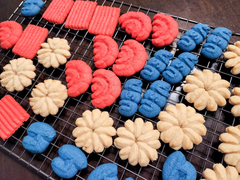 Spritz cookies have to stick to the pan as you press their shapes, so never grease cookie sheets and don’t use non-stick pans.