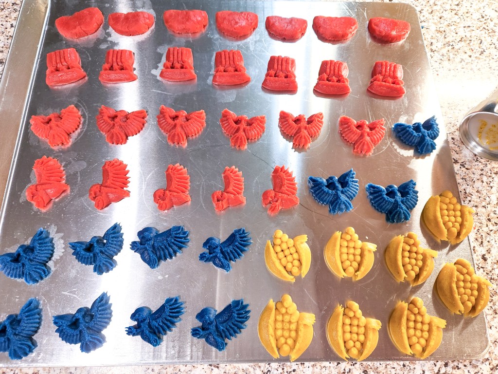 Decorating for this recipe is easy. Most of the work was done by coloring the dough! You only need to add a few accents. White icing makes stripes on the flag and stars on the banners and hats. I also traced the USA and #4 in icing to make them stand out more. I added green and white to the corn and watermelon with edible pearl dust, brushed on wet like paint with clear imitation vanilla as the liquid. You can also brush dry but for precise things like tiny stripes it’s easier wet. In the first photo below, the corn and watermelon are half done. You can see how the pearl dust is just like paint! The cookie edges, ridges, and outlines make it VERY easy to paint precisely and make these look amazing. It’s like a coloring book on a cookie. 🙂