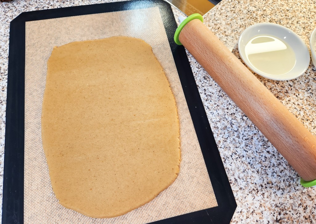 Use a regular rolling pin (preferably one with thickness spacer rings to make a perfect thickness, picture of ours at bottom of post) to roll your dough on to a silicone baking mat, parchment paper, glass cooktop, or lightly floured surface. Oil the pin and roll to a 1/4” thickness, and wide enough to accommodate the designed pin. Create a long rectangular slab of dough. The patterns on the embossed pins are designed to repeat, so you will be rolling a long rectangle of patterned dough.