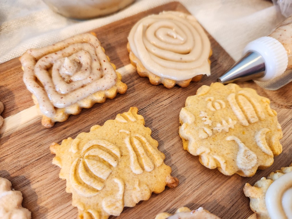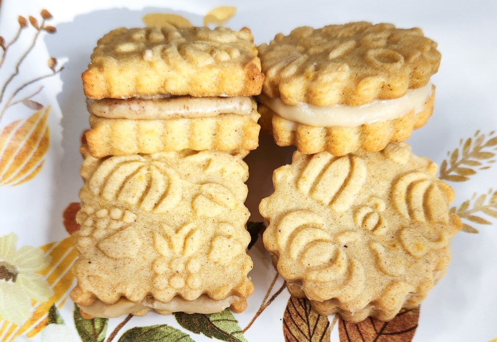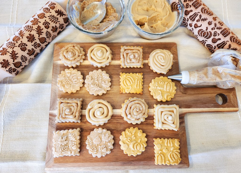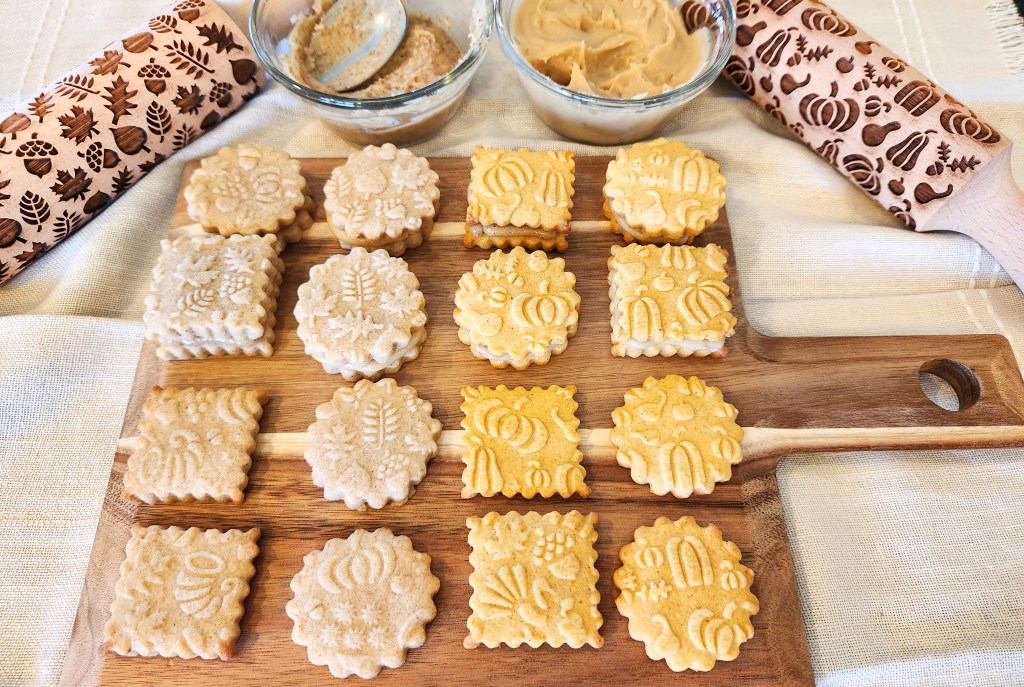 I first made these in 2016 using a cookie press. In 2022 we added embossed rolling pins, and one of the first recipes I converted for pins was the pumpkin spice! These cookies are delicious all on their own, but become downright decadent when you add the caramel pecan (nuts optional) sandwich cookie stuffing.