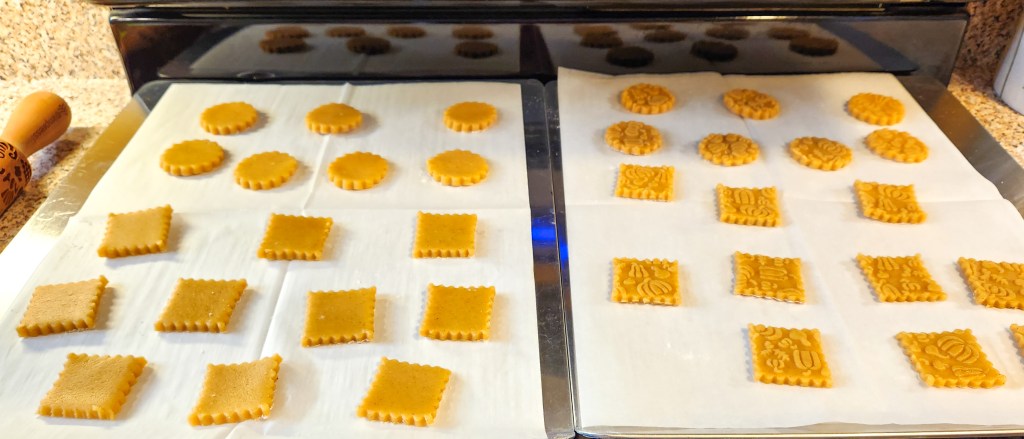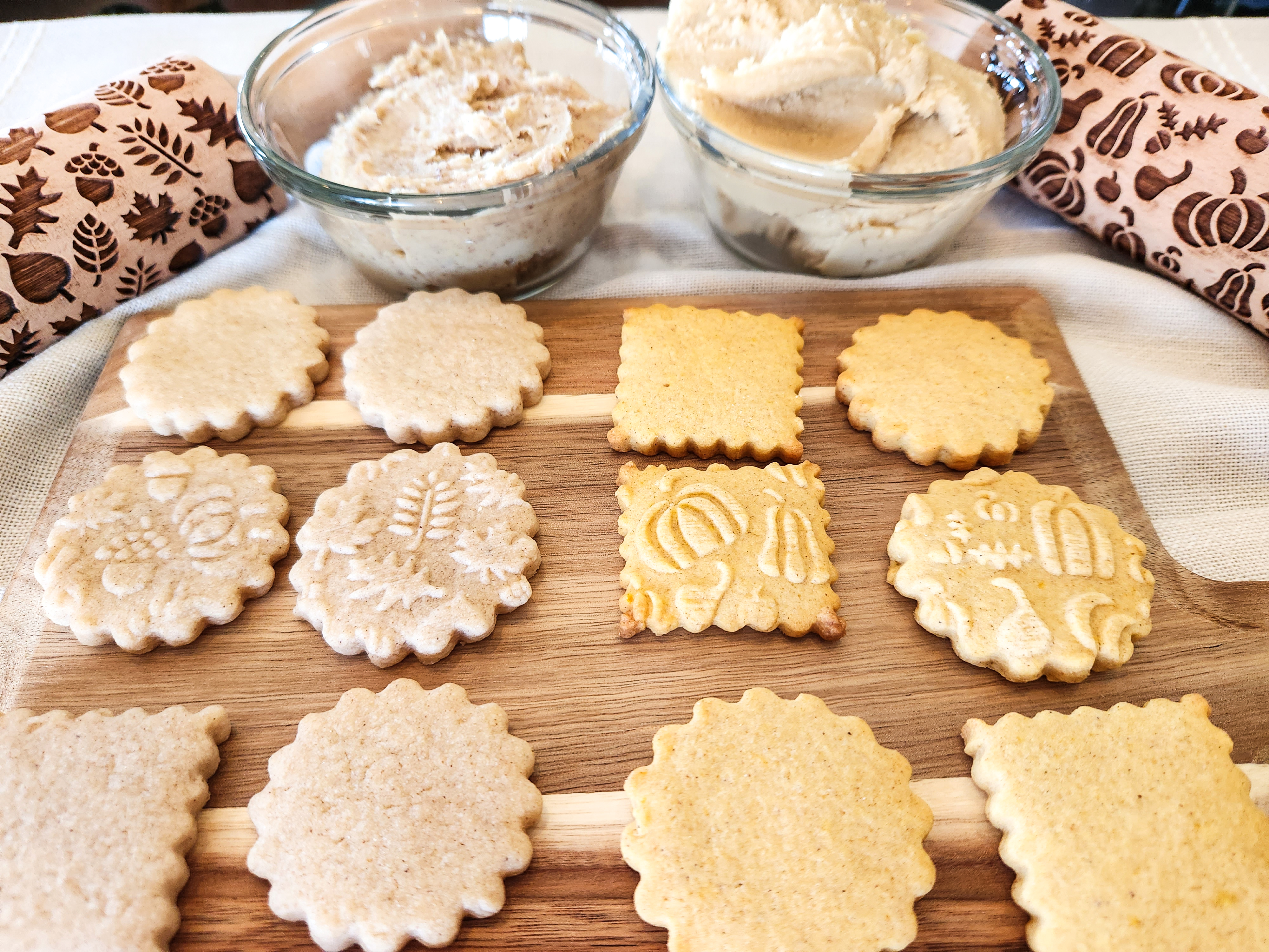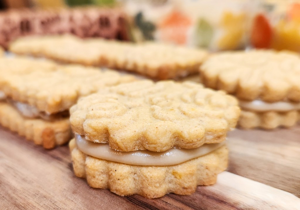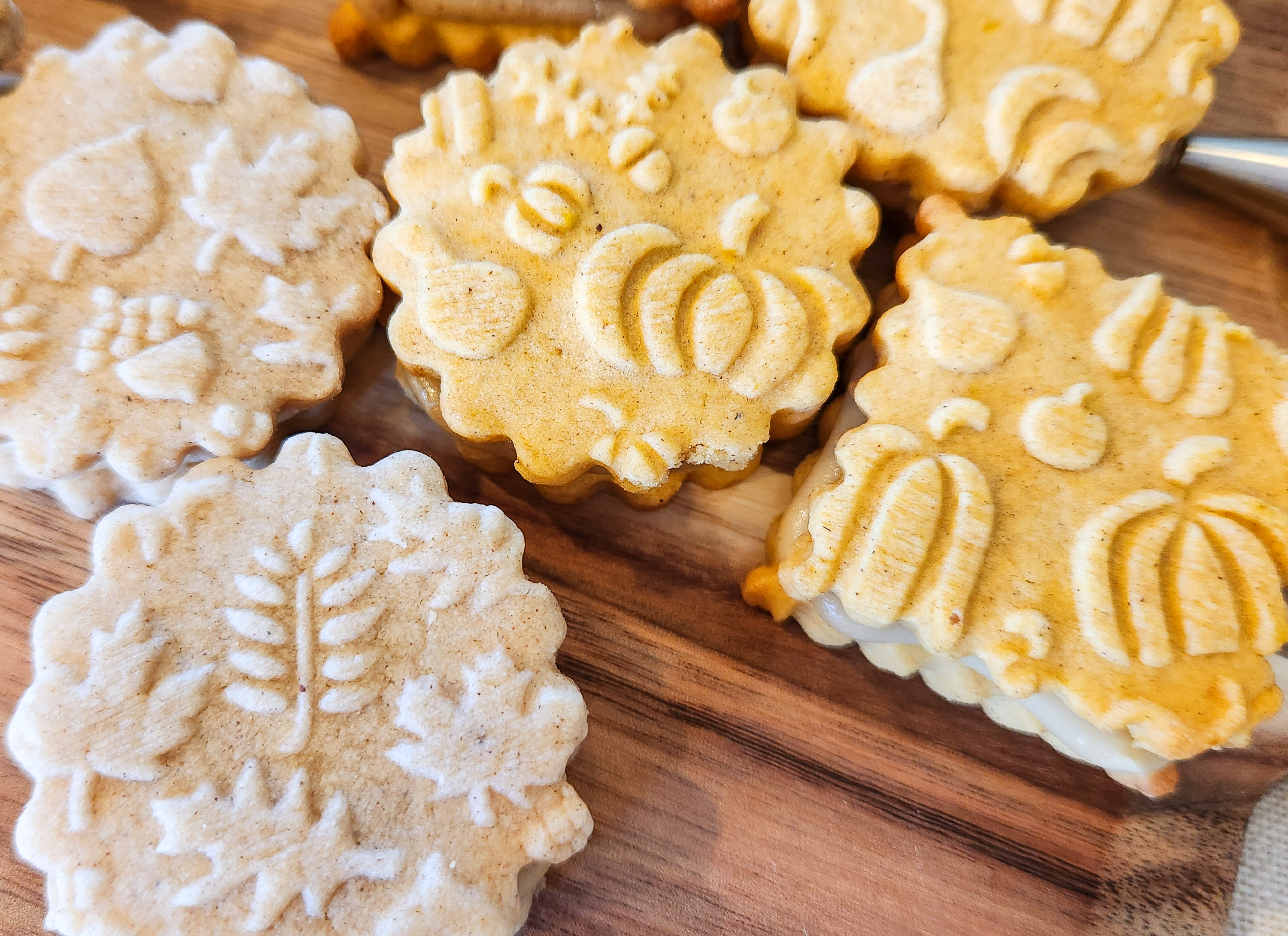 I first made these in 2016 using a cookie press. In 2022 we added embossed rolling pins, and one of the first recipes I converted for pins was the pumpkin spice! These cookies are delicious all on their own, but become downright decadent when you add the caramel pecan (nuts optional) sandwich cookie stuffing.