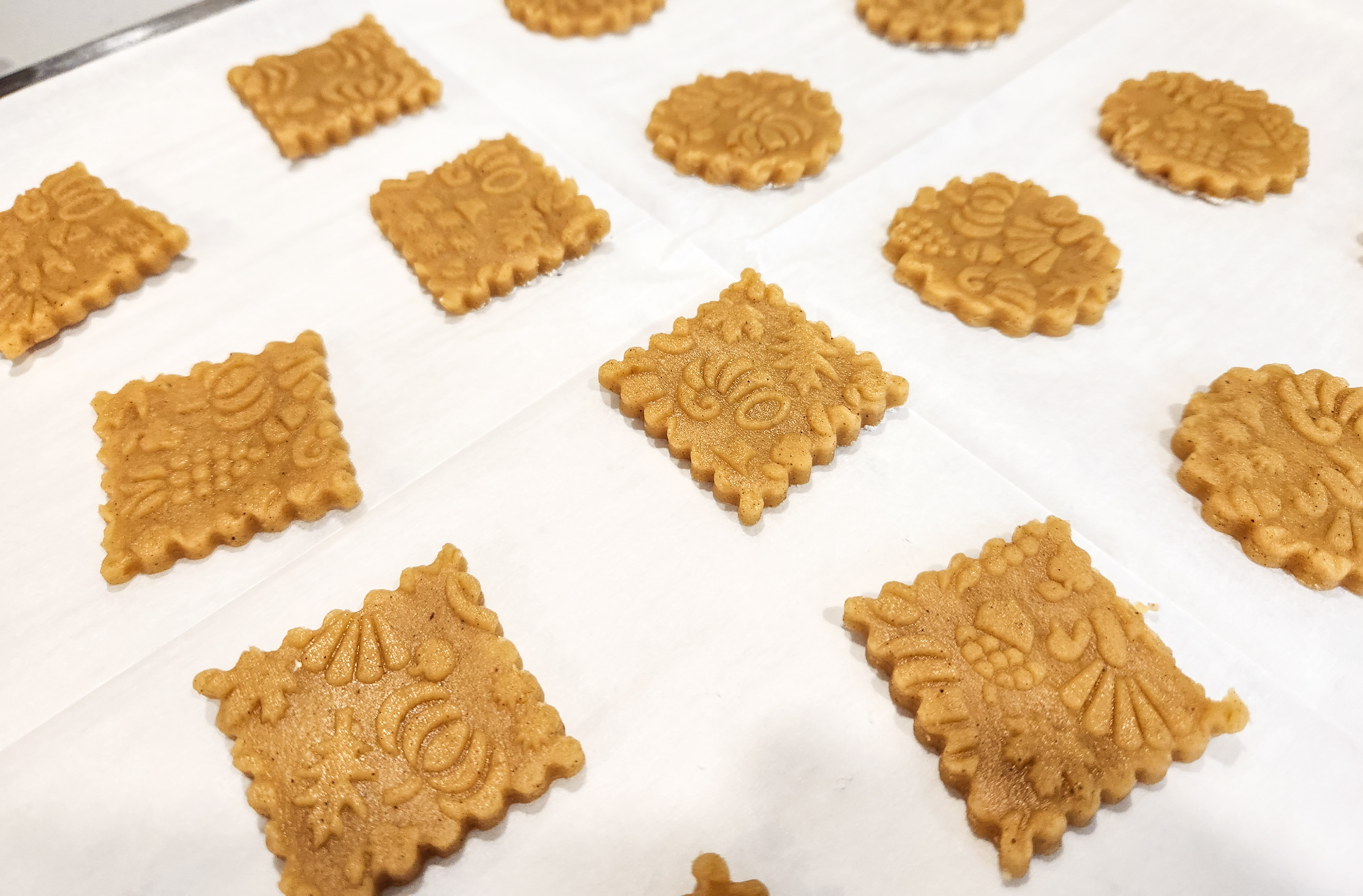 Here is a quick video of me oiling the pin, embossing this dough, cutting shapes with cookie cutters, and getting them off to parchment paper.