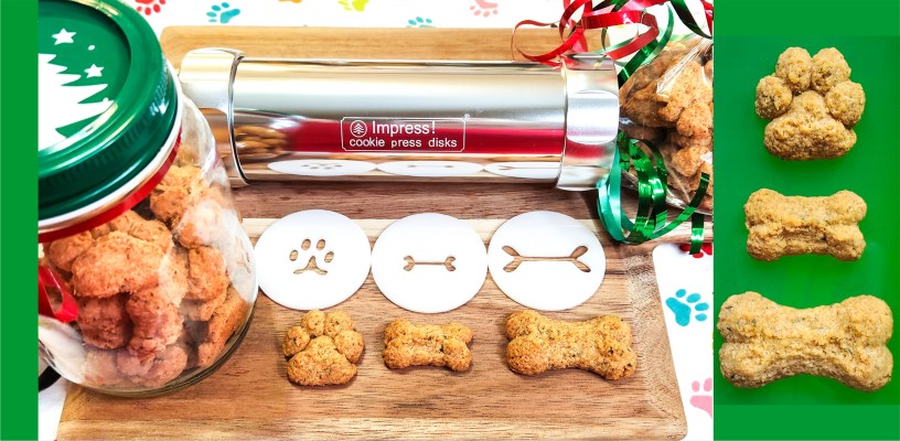 These are made with a cookie press and our paws and bones disks. The recipe is simple and straightforward. As they are not “people cookies” they have a much more rustic, textured appearance. These disks make great people cookies, too!