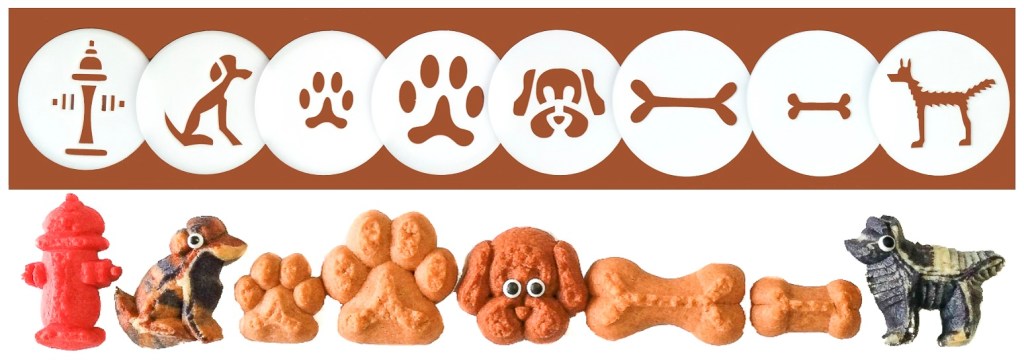 If you maintain a nice even, stiff pressure the treats will form nicely. It will feel especially different pressing the small bones, as you will not need even close to a full “click” to press them (referring to “one click-per-cookie type presses). You will hardly feel them stick to the pan. If any of the shapes do not release from the press well, you can easily pull them off with your fingers and set them on the pan! Count on pressing/applying pressure slowly and steadily for a few seconds per shape. Watch the video to see what I mean!