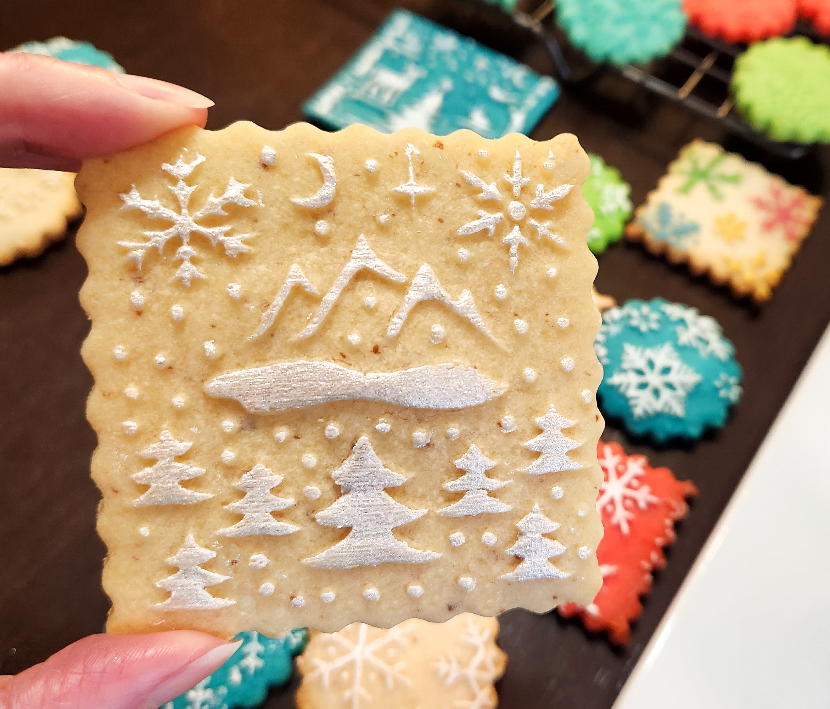 When my daughter Amanda saw the decorating on these cookies she squealed, “Mom they look like wrapping paper!” And I couldn’t unsee it! These cookies look like tiny gifts wrapped in shiny snowflake and winter scenes paper. They’re patterned with embossed rolling pins on colored dough, and the shimmery decorating is a touch of luster dust.