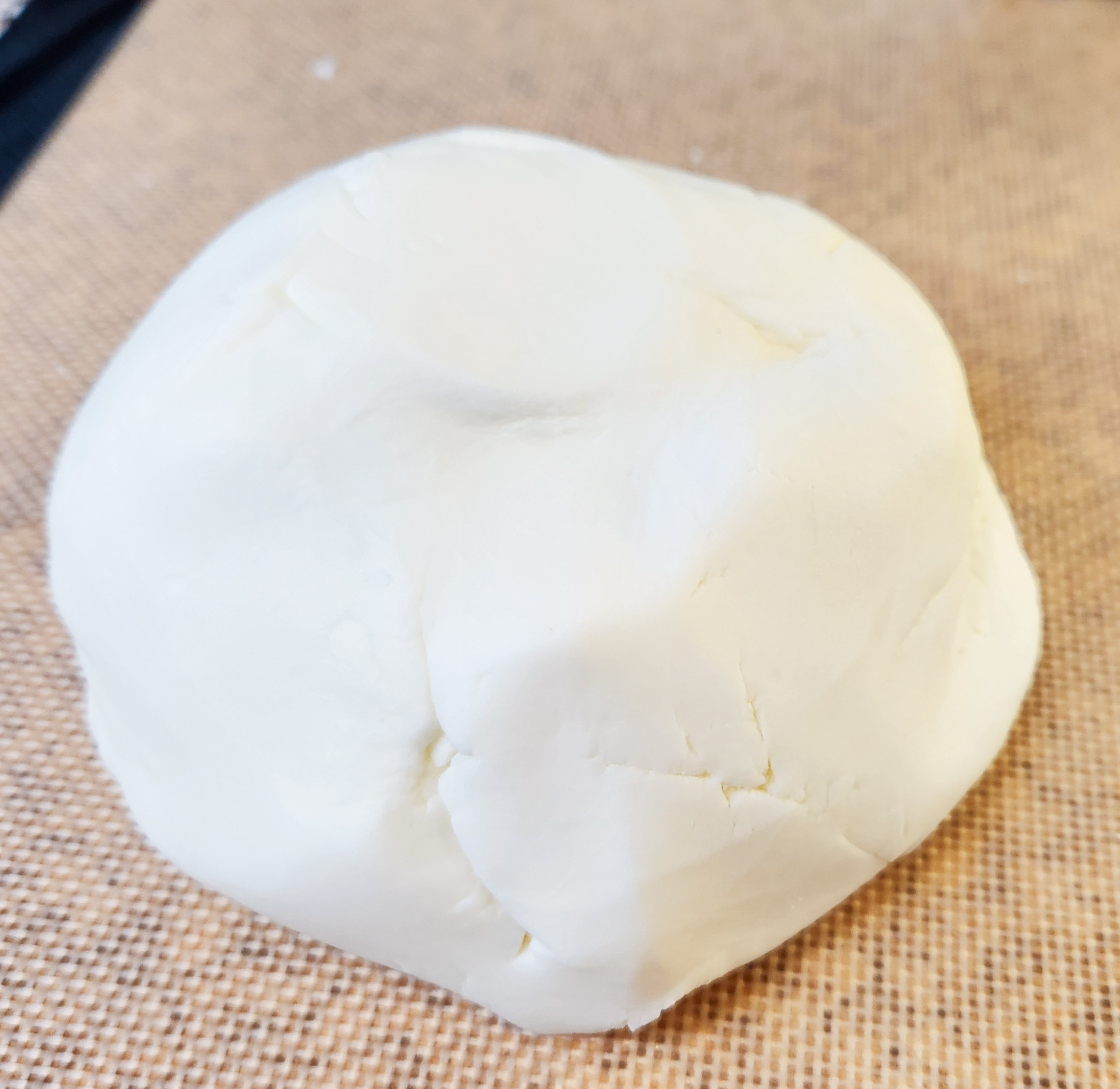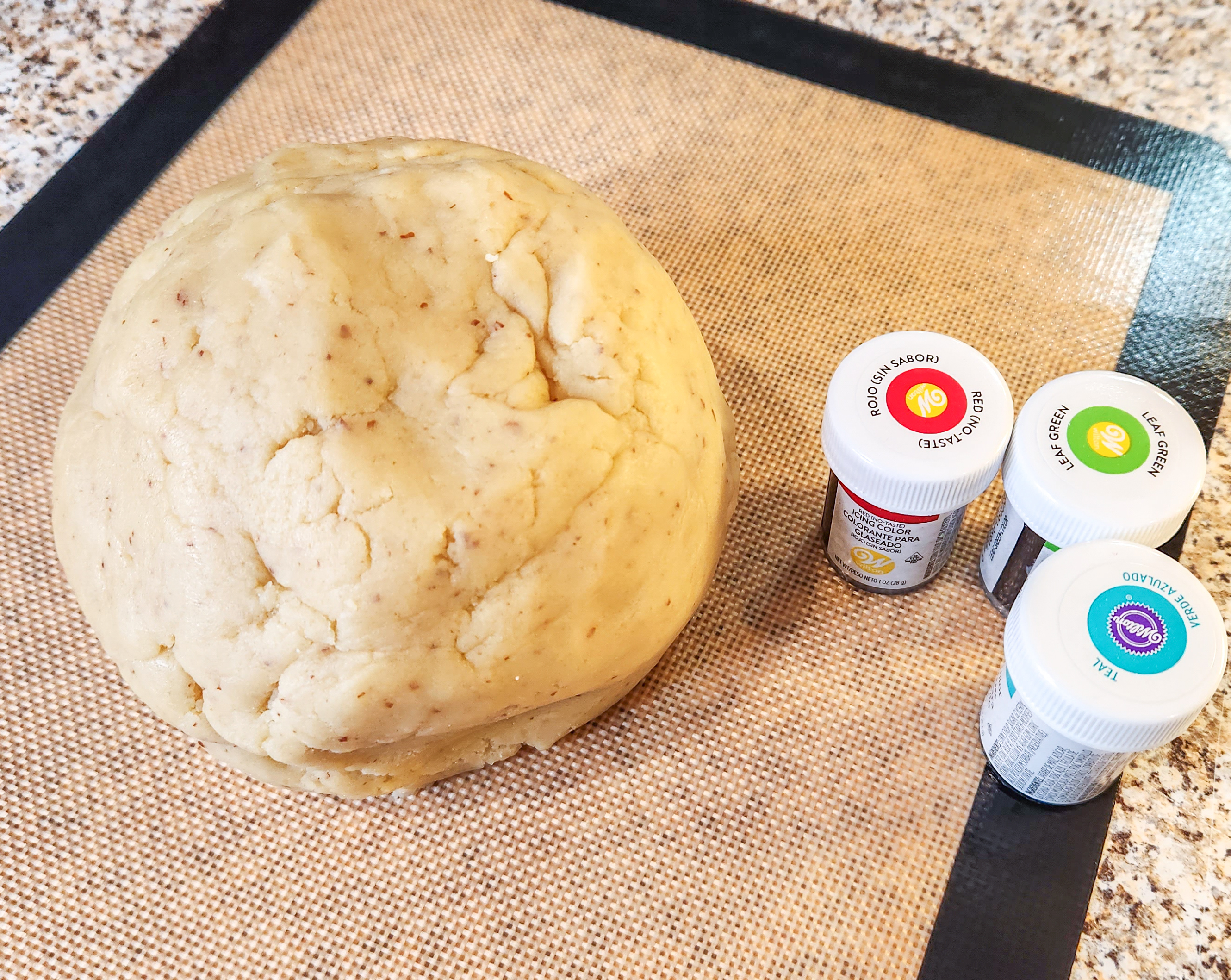 Cream the butter with an electric mixer, then add the heavy cream and almond extract and mix thoroughly. Add powdered sugar a little at a time. Do not be alarmed or surprised! This mixture will be very dry and crumbly, so finish kneading by hand until a smooth clay-like dough forms. It will be much stiffer than the almond cookie dough. Keep kneading even if it seems very stiff, until it forms a workable ball as pictured. It will warm and soften as you work it. Add cream to an overly stiff mixture, or powdered sugar to a soft sticky mixture, as needed to get a workable clay-like consistency. It will be fun to knead, though still quite stiff, when it’s the right texture.