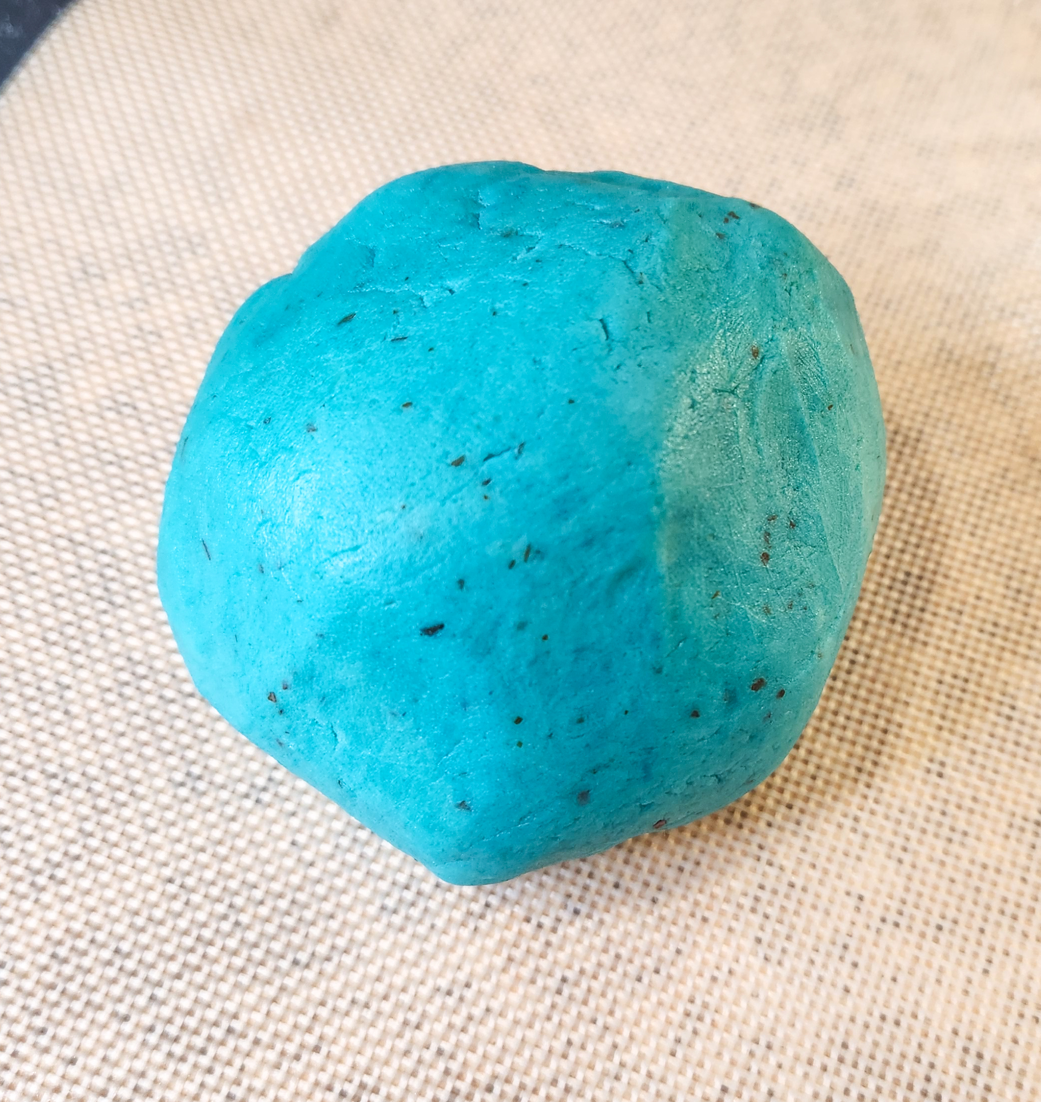 If you’re coloring this dough make sure you are using gel food colors as liquid affects consistency too much. I use a knife or toothpicks to add the color to my dough and knead it by hand. Remember to start with just a little color – you can always add more, but you can’t take it out! I love this teal color. With the almond flecks it looks like a robin’s egg.😊