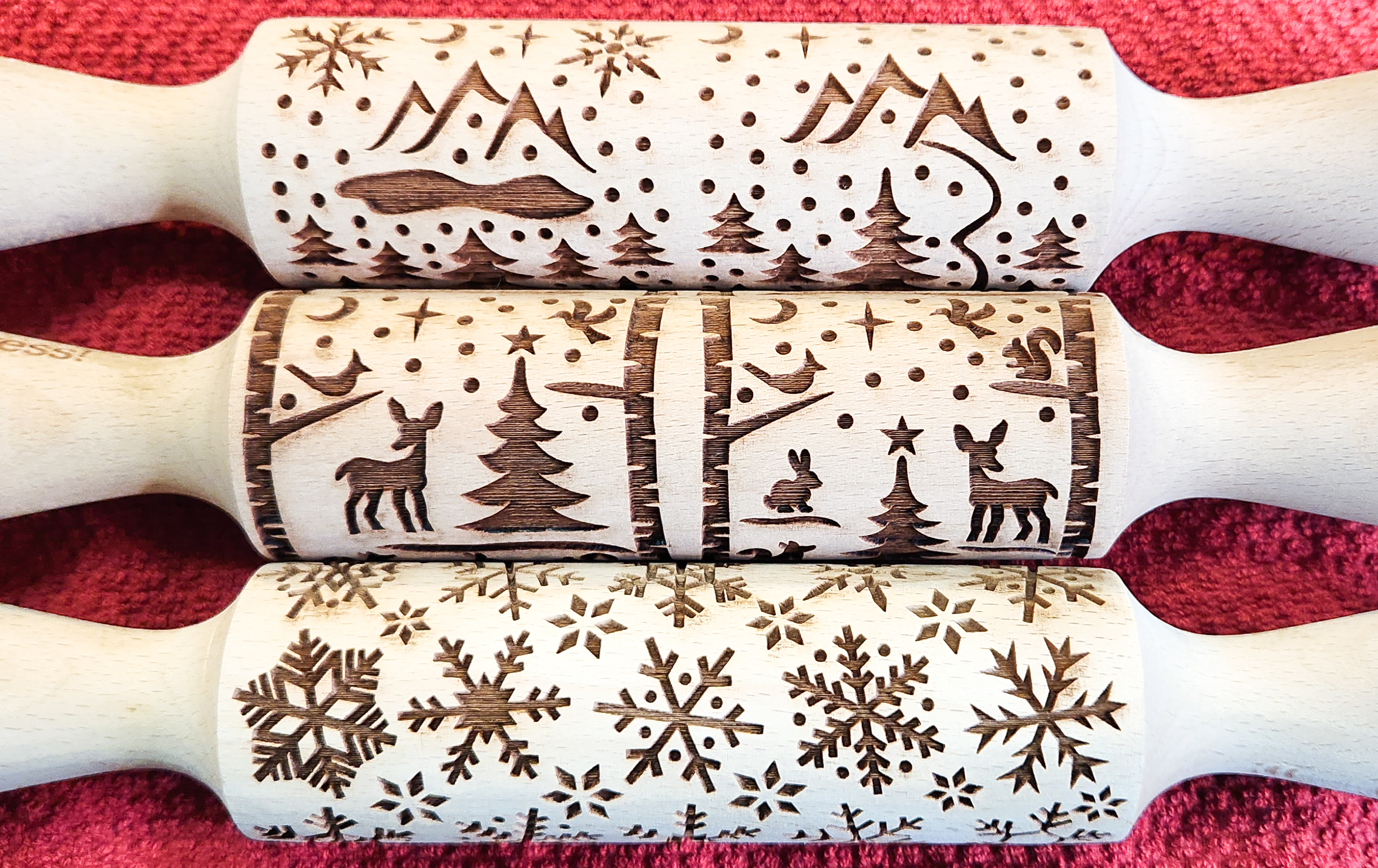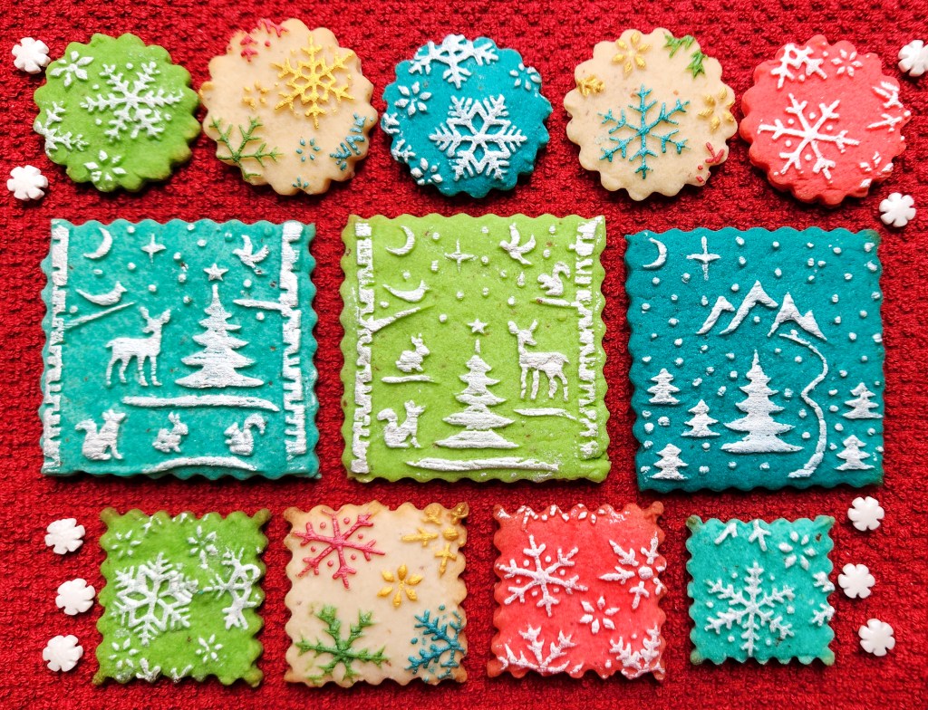 The patterns are made with 3 of our embossed rolling pins: Snowflakes, Winter Mountain Scene and Winter Animals Scene. The snowflakes were cut out with small round and square cookie cutters, and the scene cookies were cut with a wavy chopper/crinkle-cut knife to make ruffled edges. You could get a similar effect with a fluted pastry wheel.
