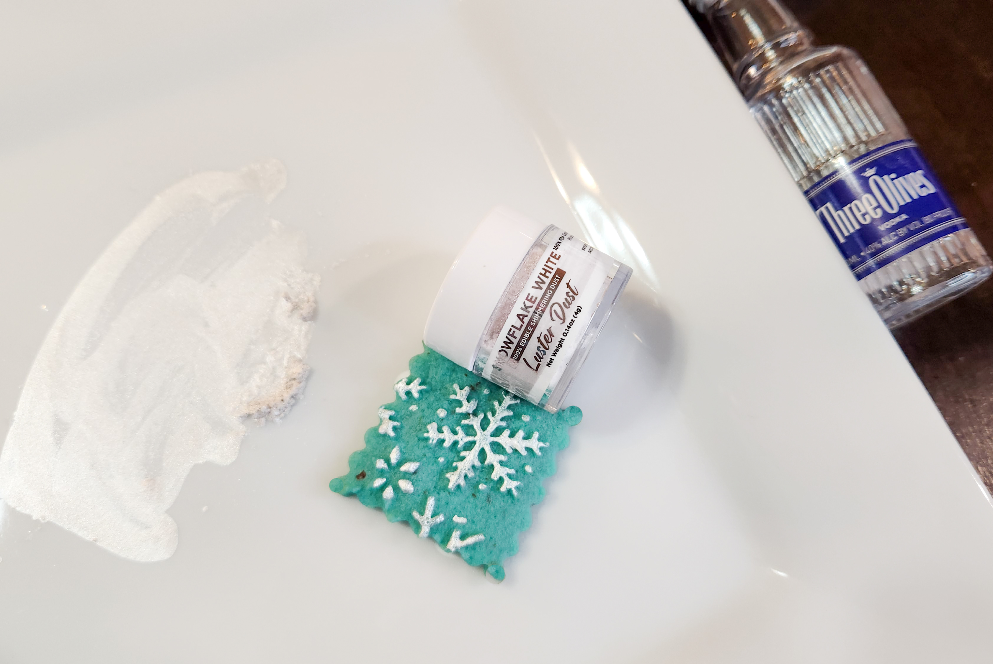 This technique is finger painting luster dust onto the embossed cookies. This is a “wet” technique, using vodka as the paint base. The alcohol evaporates quickly and dries with no taste! You can also use canola oil as your paint base. Using canola oil won’t stain your fingertips as much as the vodka does, if that’s an issue for you. I know it comes off in the next shower so it doesn’t bother me. LOL The white dust will not stain your fingers at all, no matter how you use it.