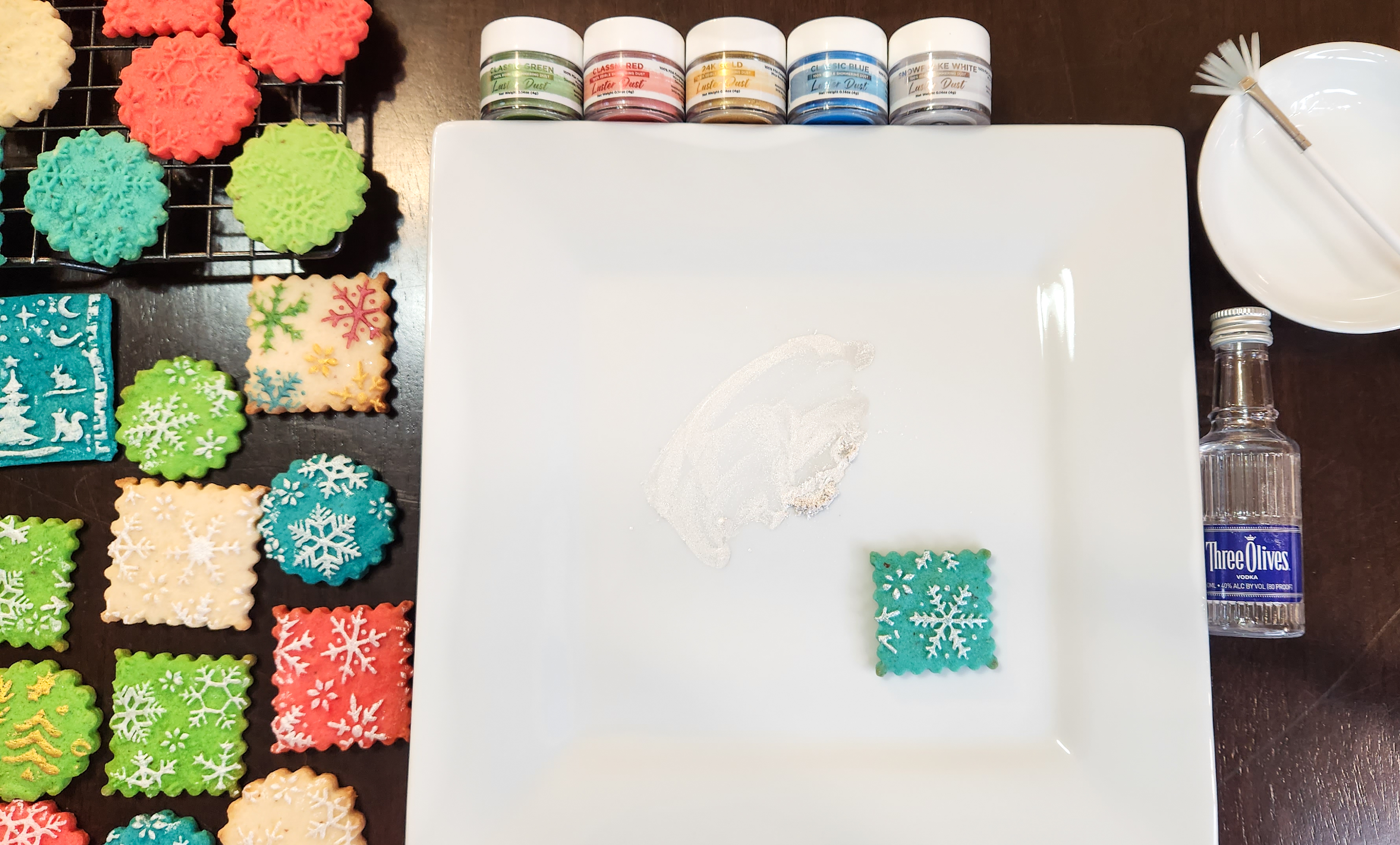 Luster dust is what makes this beautiful presentation possible. I use it so often in my cookie press posts that this year (2022) we’ve started selling it on our website and Etsy shop! We chose to partner with an American company, Bakell, that makes dusts here in the USA. They make gorgeous dusts that are silky, vibrant, and a joy to work with. Their 4 gram jars last and last. A little goes a long way!
