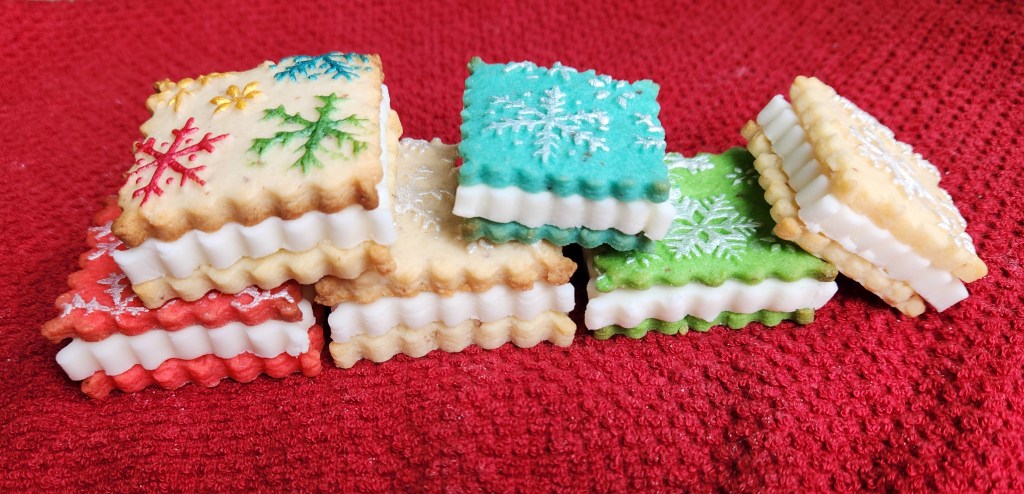 I only sandwiched the small snowflake cookies as the scenes would be way too much.