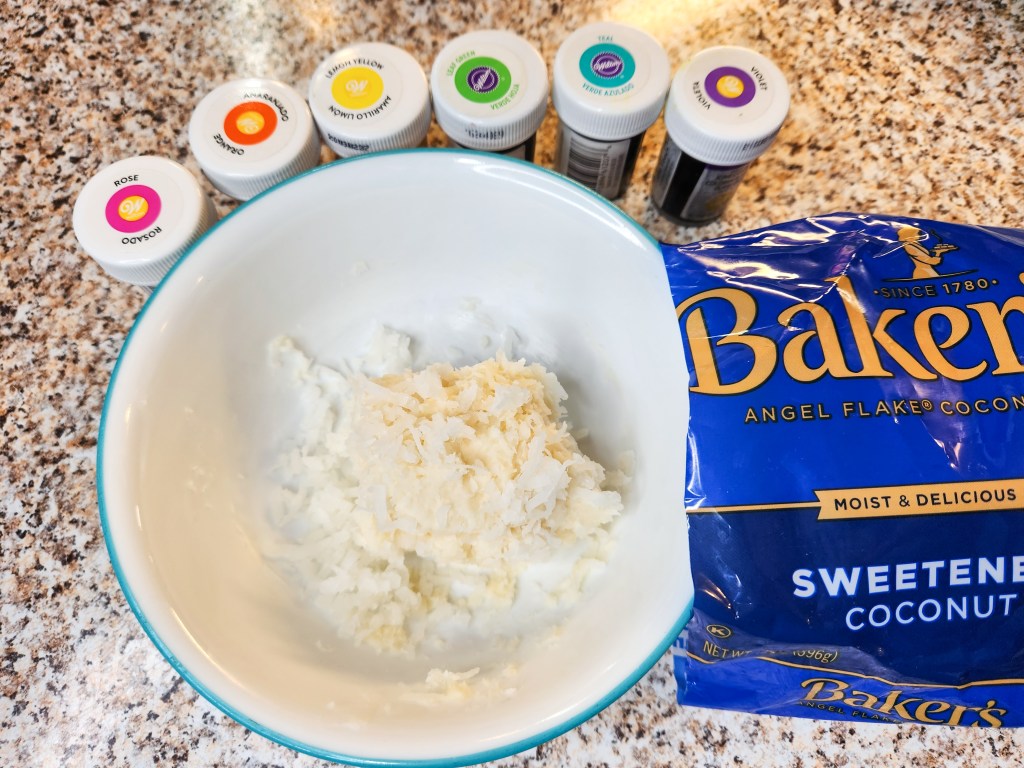 Add GEL food coloring to make Easter colors! To add color, use gel food dye and add a little at a time. You can always add more but you can’t take it out! I dip the tip of a toothpick into the gel, and add it to the buttercream and coconut.