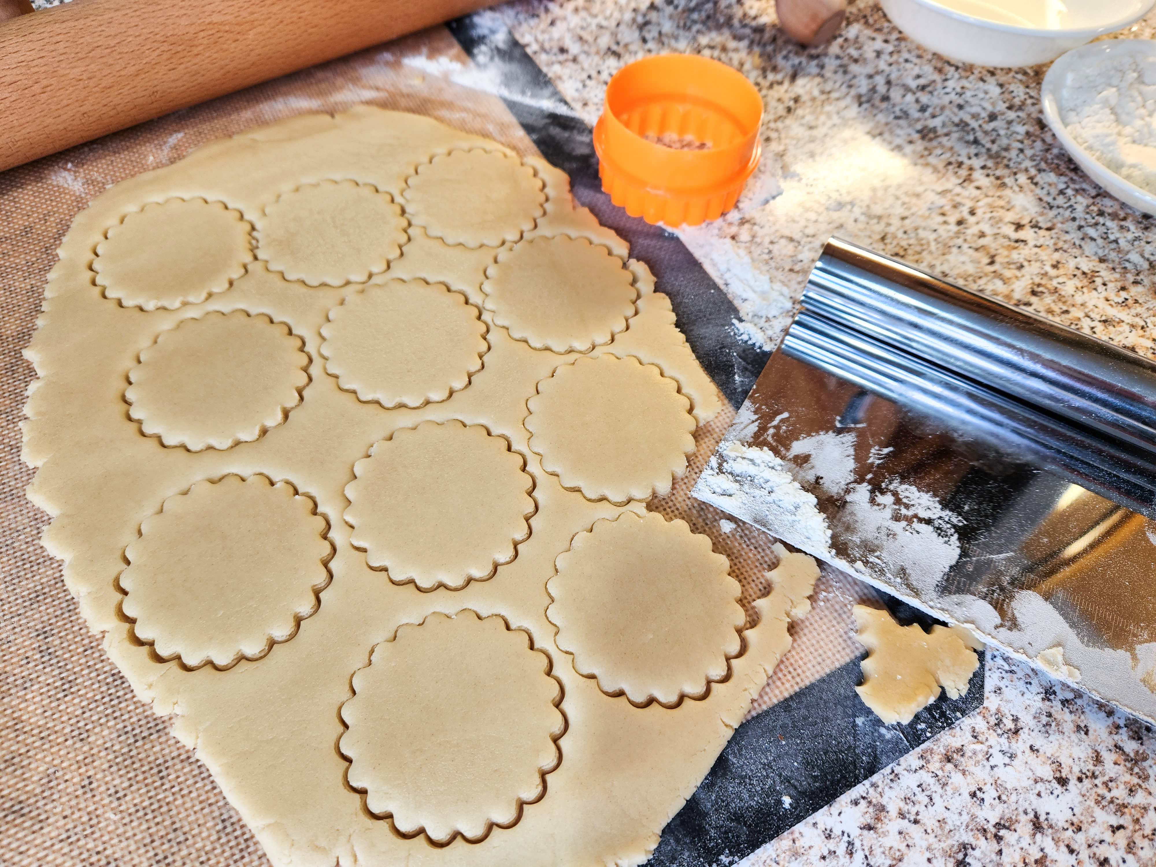 Here’s a quick video clip of me stamping the dough, cutting shapes and lifting them.