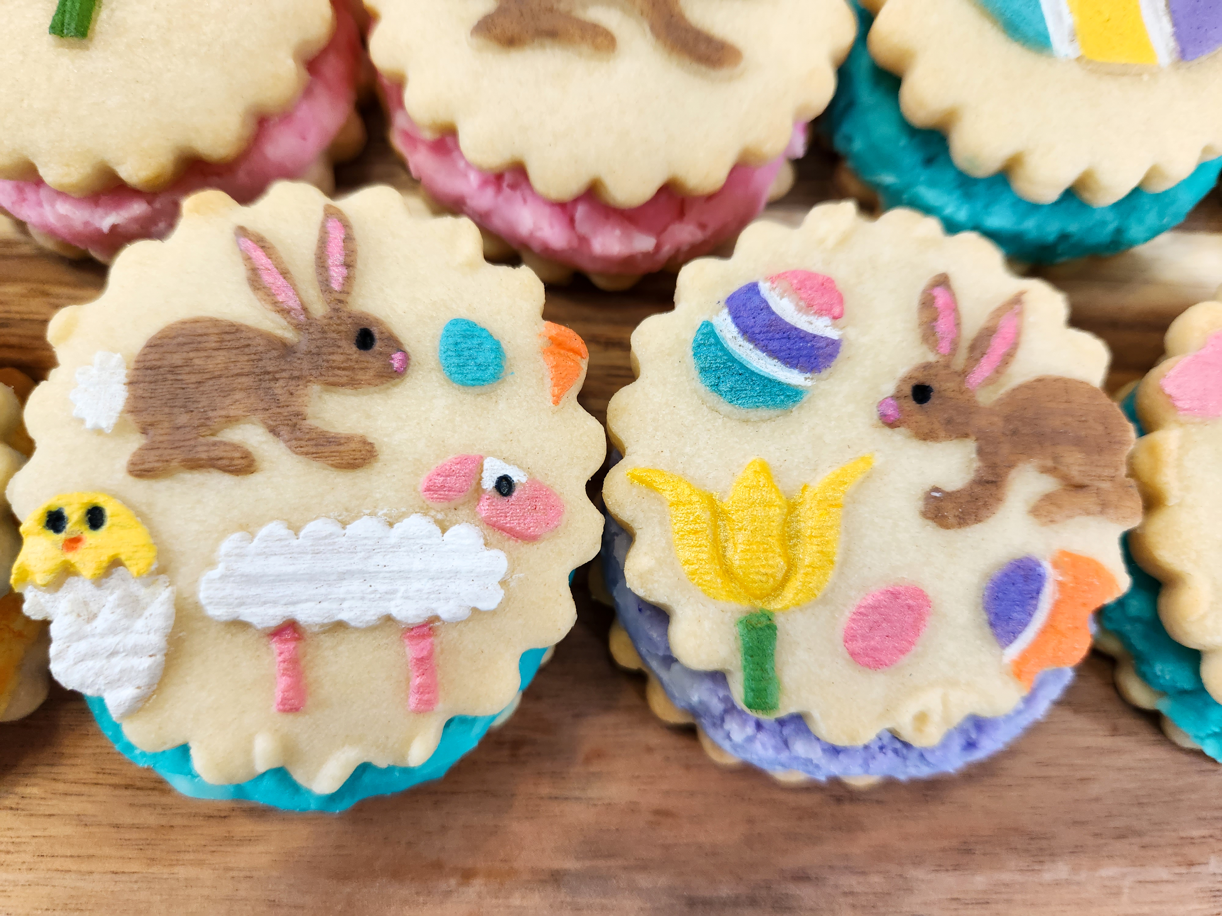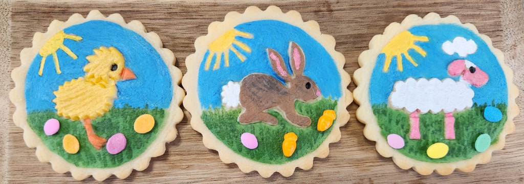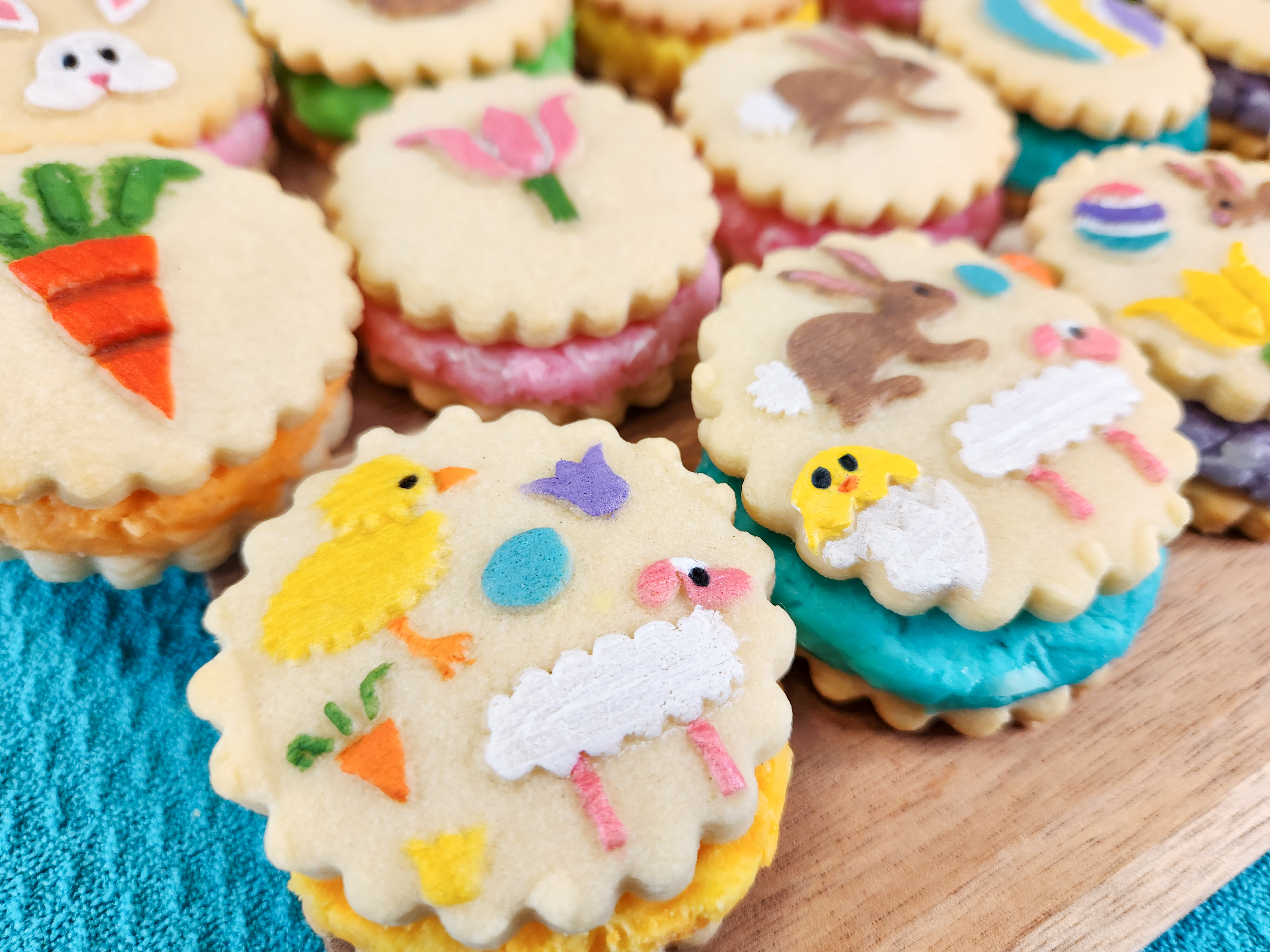The 3 cookies on the right are a little bigger than the sandwiches. I used a bigger cookie cutter to give me space to paint a scene! The chick, bunny, and lamb got to frolic in a grassy field in sunny blue skies! With the animal shapes being raised, it was simple to paint them and then paint around them. SO fun! I added some egg and carrot decors, too.