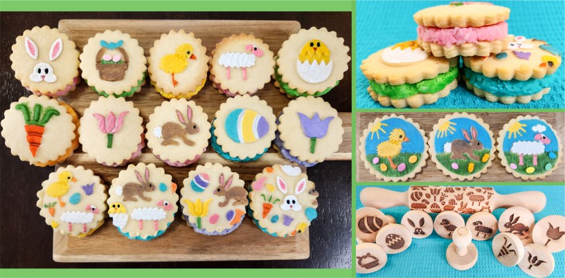 This is the second post using our new 2 1/4″ cookie stamps! As the year goes on we will be rolling out (pun intended!) stamps for all four seasons and many holidays. They’re available on our website and Etsy shop. You can make many sizes of cookies with them, from the small-medium sandwich cookies shown here to big 3 1/2″ cookies!