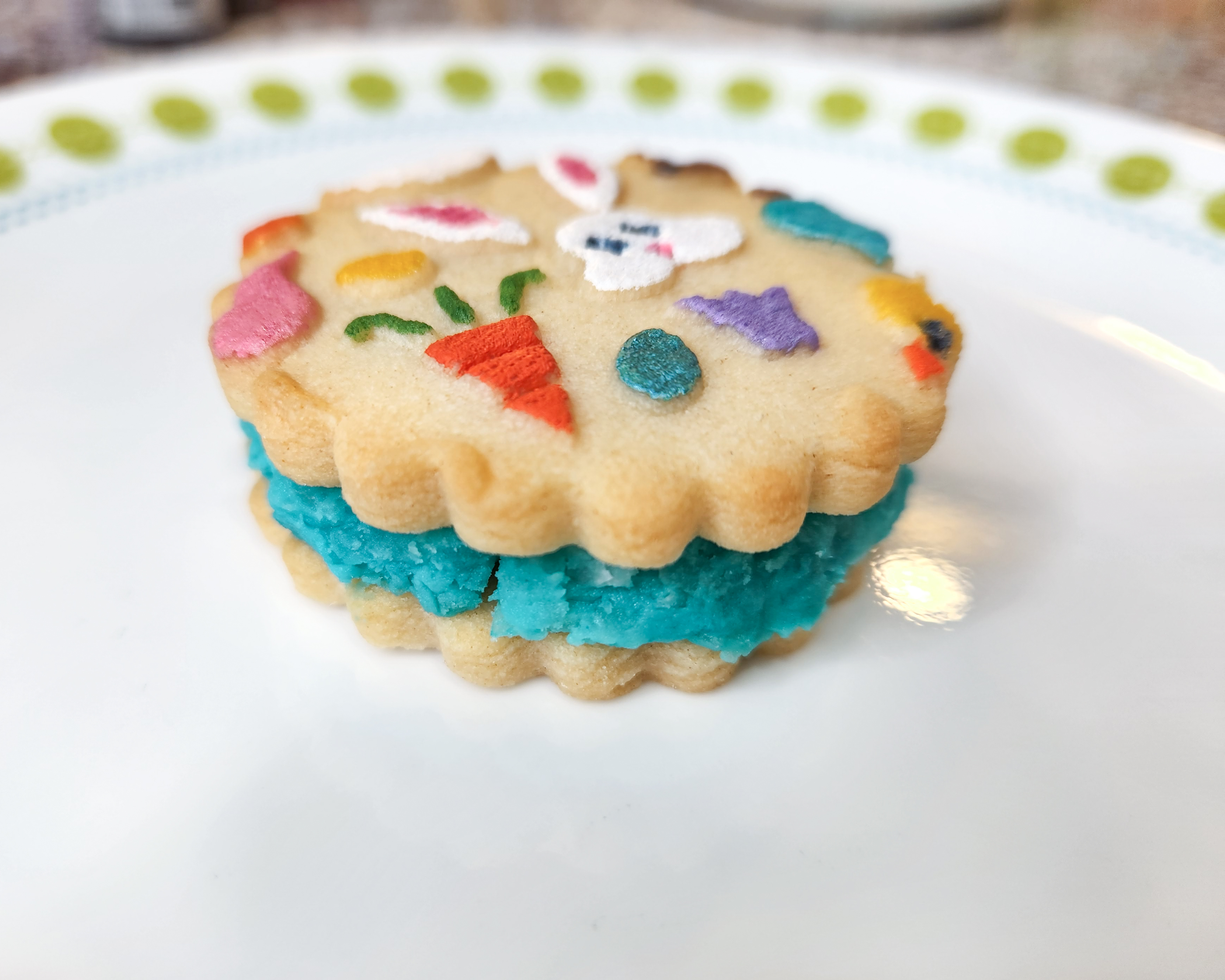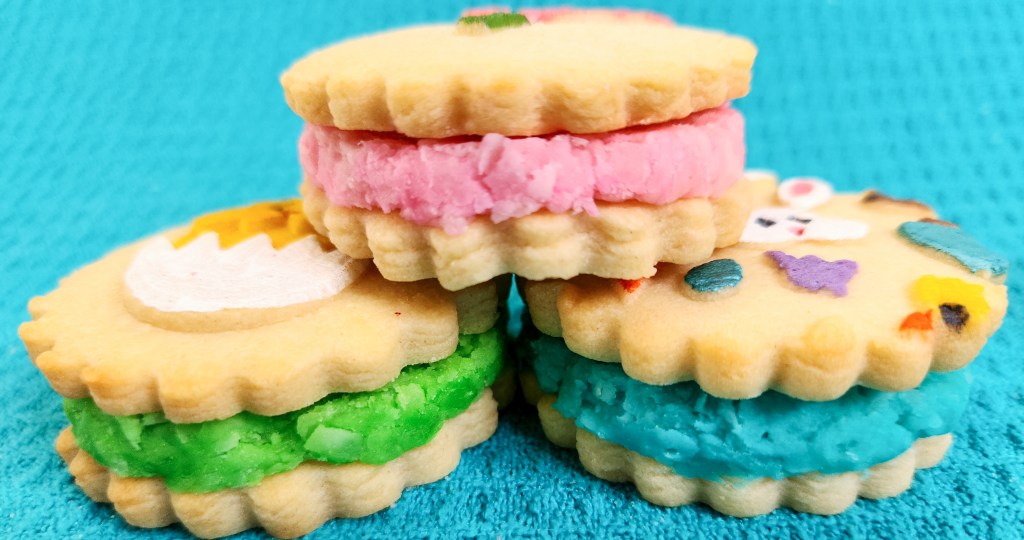 Once you have your coconut and color mixed in, roll small balls of the mixture in your hand and flatten them. Make little disks that fit on the bottom cookies. Smooth the edges with a damp finger. Press down GENTLY on the top cookie. If they aren’t sticking together, slightly wet the tops and bottom surfaces of the icing and it forms a better bond.