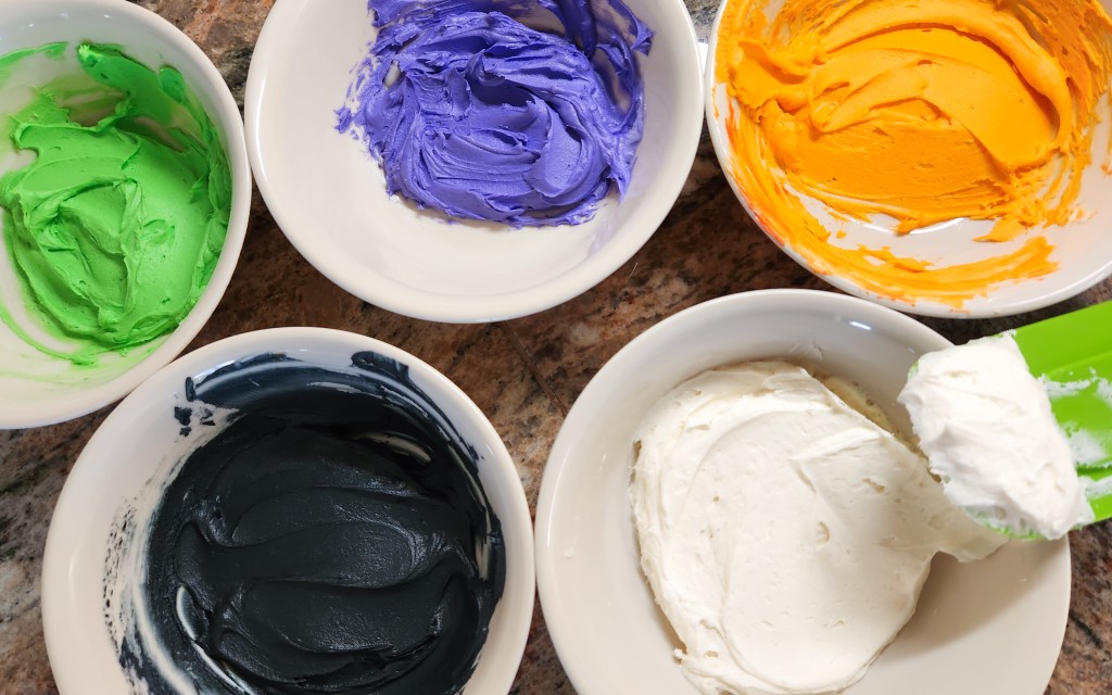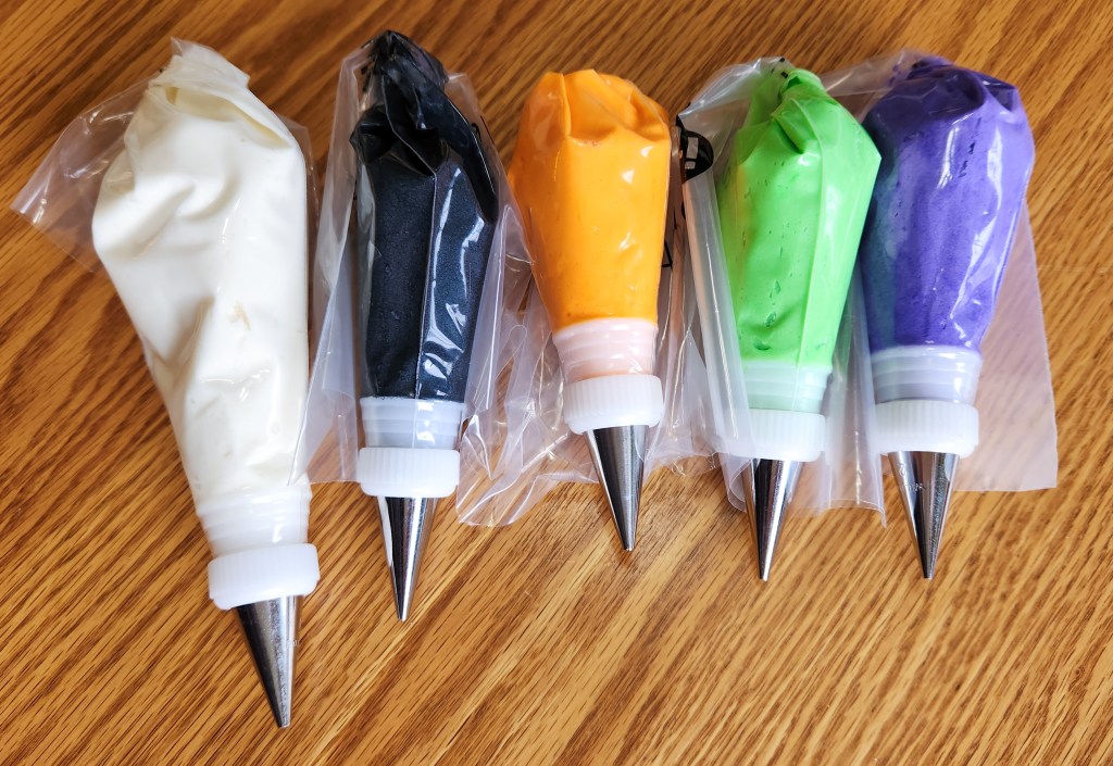 Use GEL food coloring (not gel icing, use gel food dye/coloring) to tint your icing. Liquid affects texture too much. I use a toothpick to add my color. Always start with a little bit- you can add more but you can’t take it away! Use decorating bags and tips. You’ll only need a small-ish round writing tip.