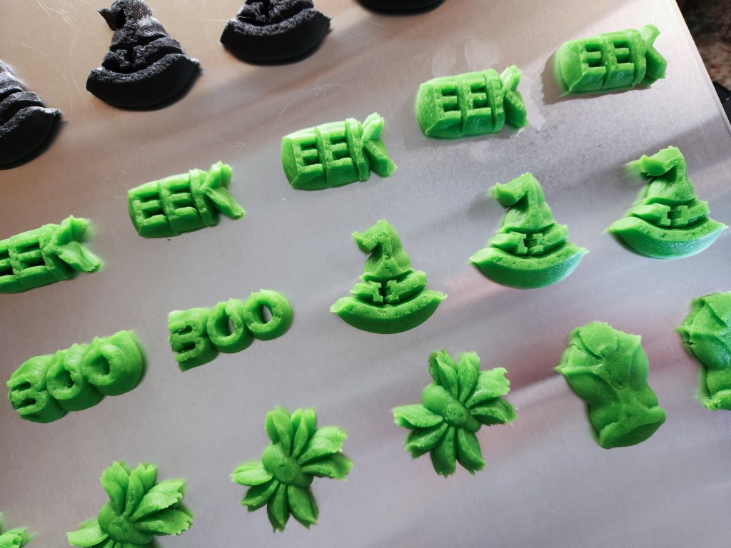 The shapes pressed easily in this dough. Try to keeps your shapes on the small side, neat and tidy. Don’t let them spread out into blobs. Keep the words small and tight with neat ridges. Use your fingers to adjust anything that looks off to you. The left side of the words sometimes spread, just push them in a bit. Pinch the tips of the candy corn so they’re pointy, and straighten the sides if they spread.