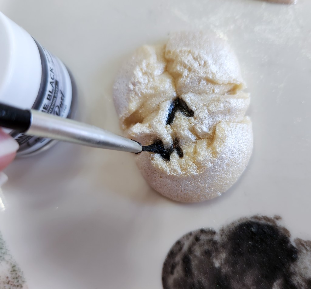 Now add accents to these shapes. For the skull, wet paint with black luster dust. Use the same technique for the jack-o-lanterns.