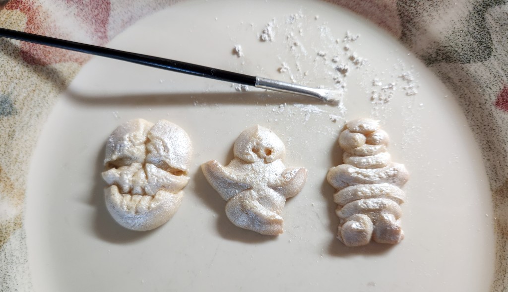 Dry brushing is just like it sounds. Use a dry brush to smear luster dust on top of a cookie. It makes a wonderful affect on white cookies like the ghost (and come winter, snowflakes!).