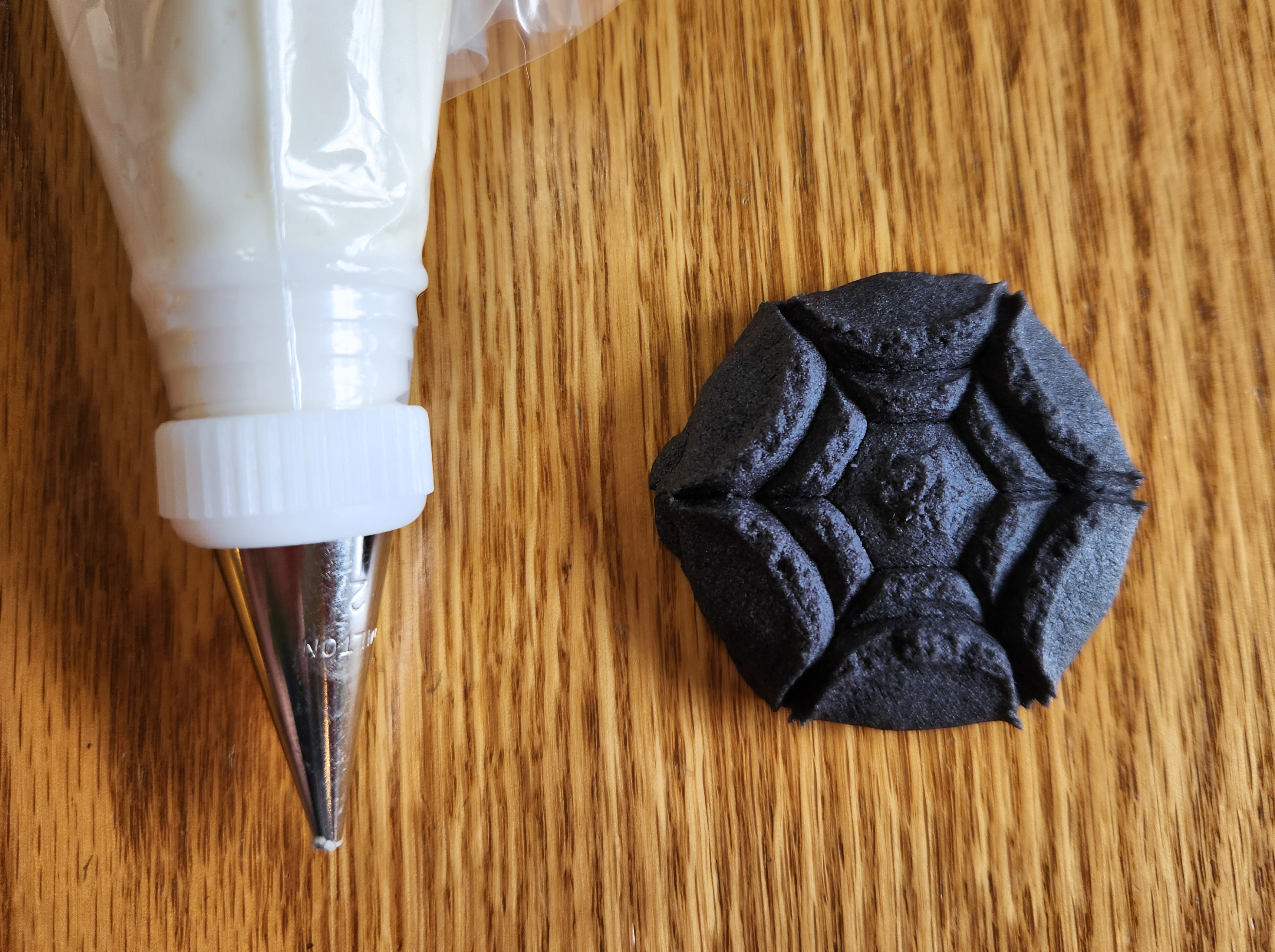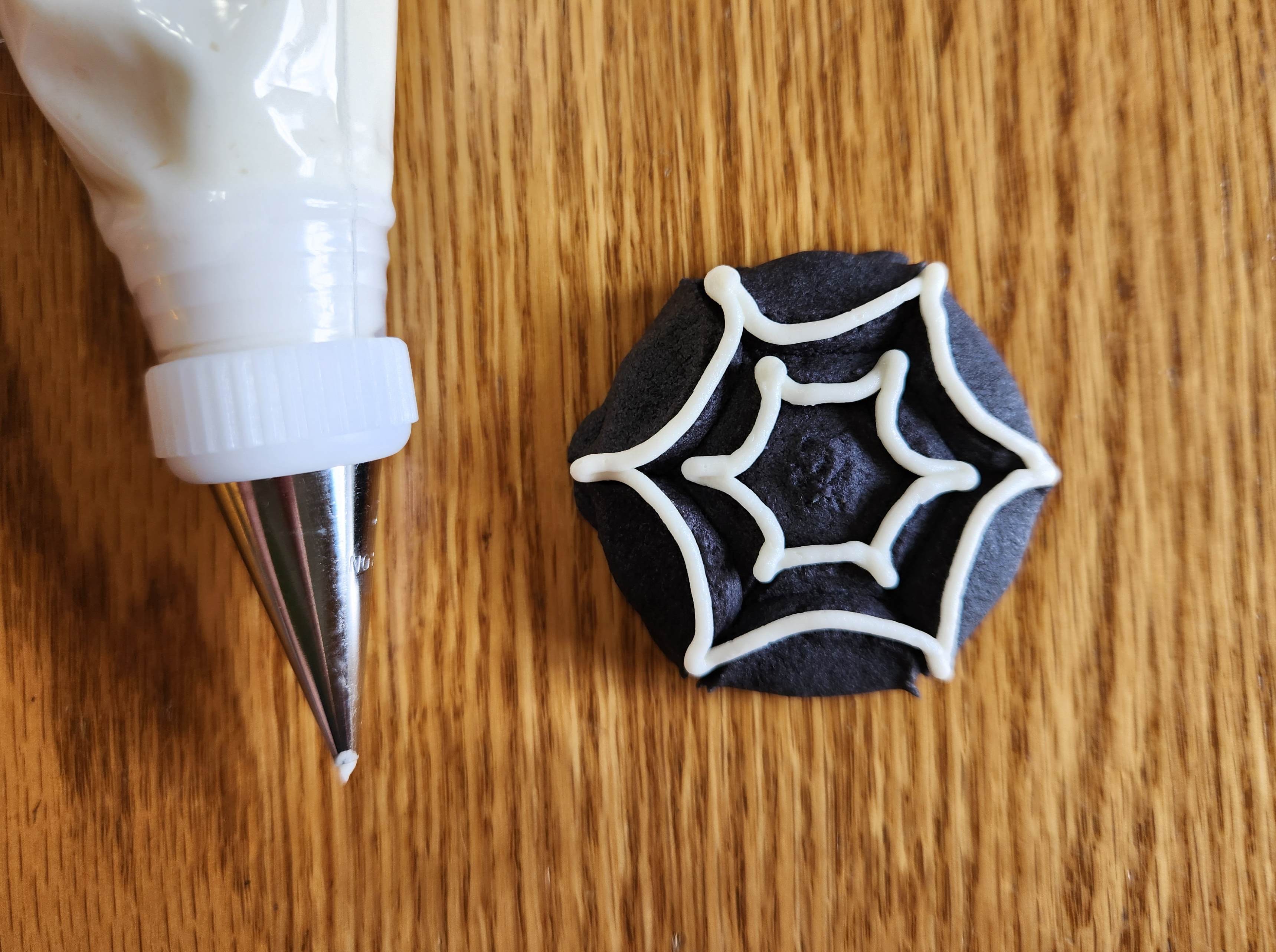 Use the icing to add the webs to the spiderweb cookies. It’s SO easy because the cookie lays out the pattern for you. Follow this photo guide. Trace the inner and outer ridges of the hexagons, then crisscross the cookie through the center with 3 straight lines. I did mine white on black cookies and black on orange cookies. Tip: it’s always best to start and stop your lines with a dot, it makes a cleaner look.