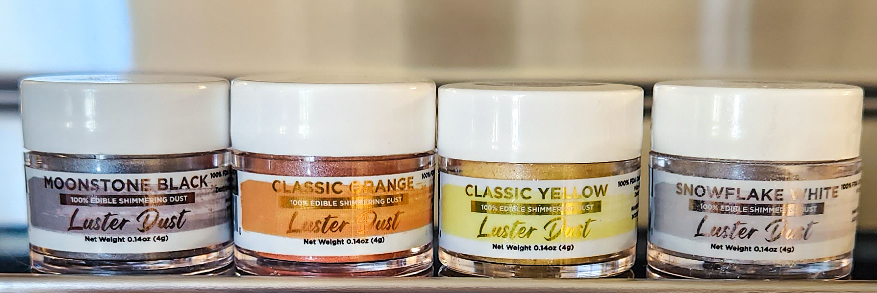 NOTE: Whatever brand you use, always make sure you are using EDIBLE dusts! Some luster/pearl/glitter dusts on the market are “non-toxic” but that does not mean they are edible. Plenty of brands have actual food ingredients and are marked “edible”. ONLY use those for safety’s sake!