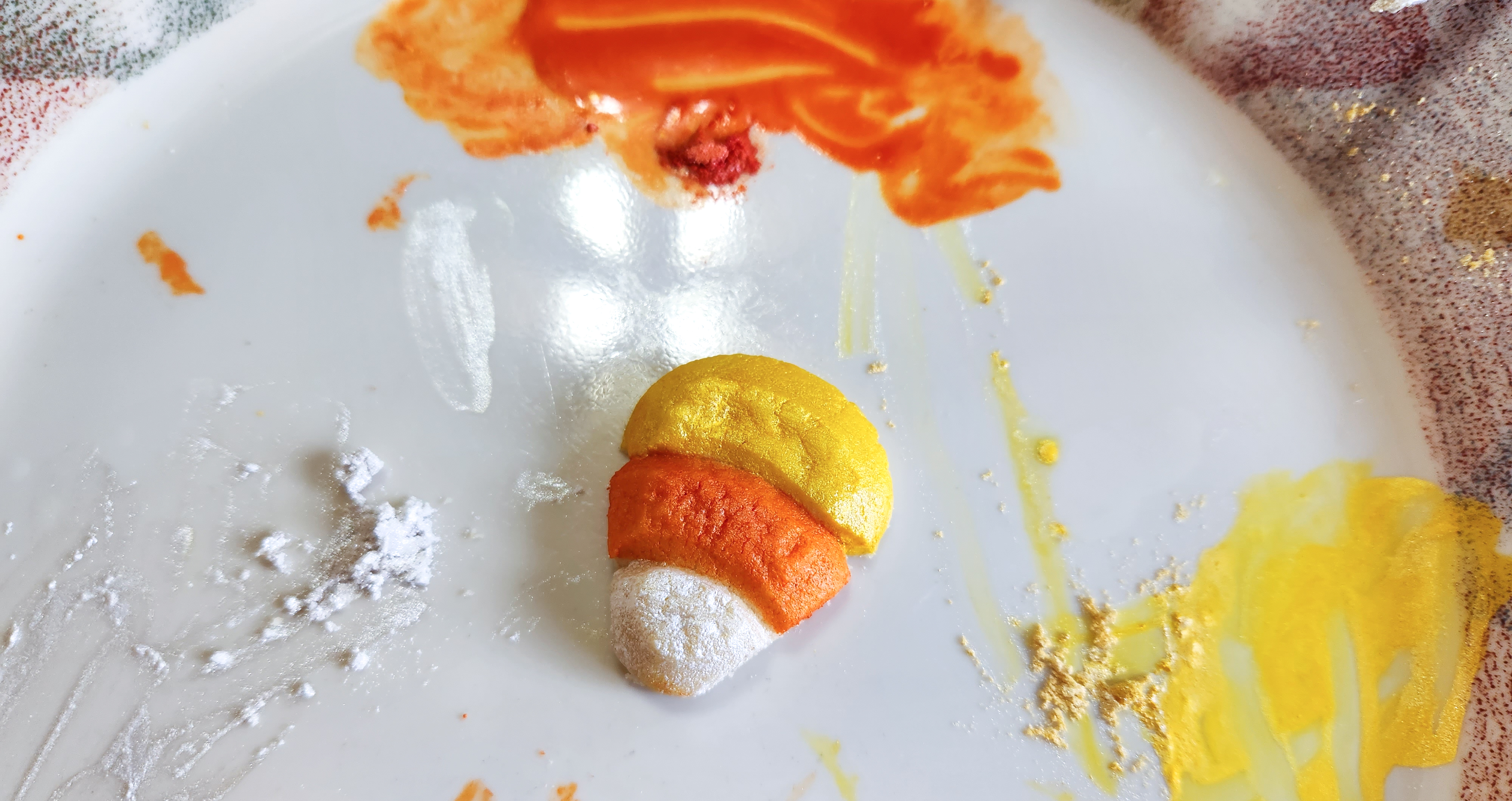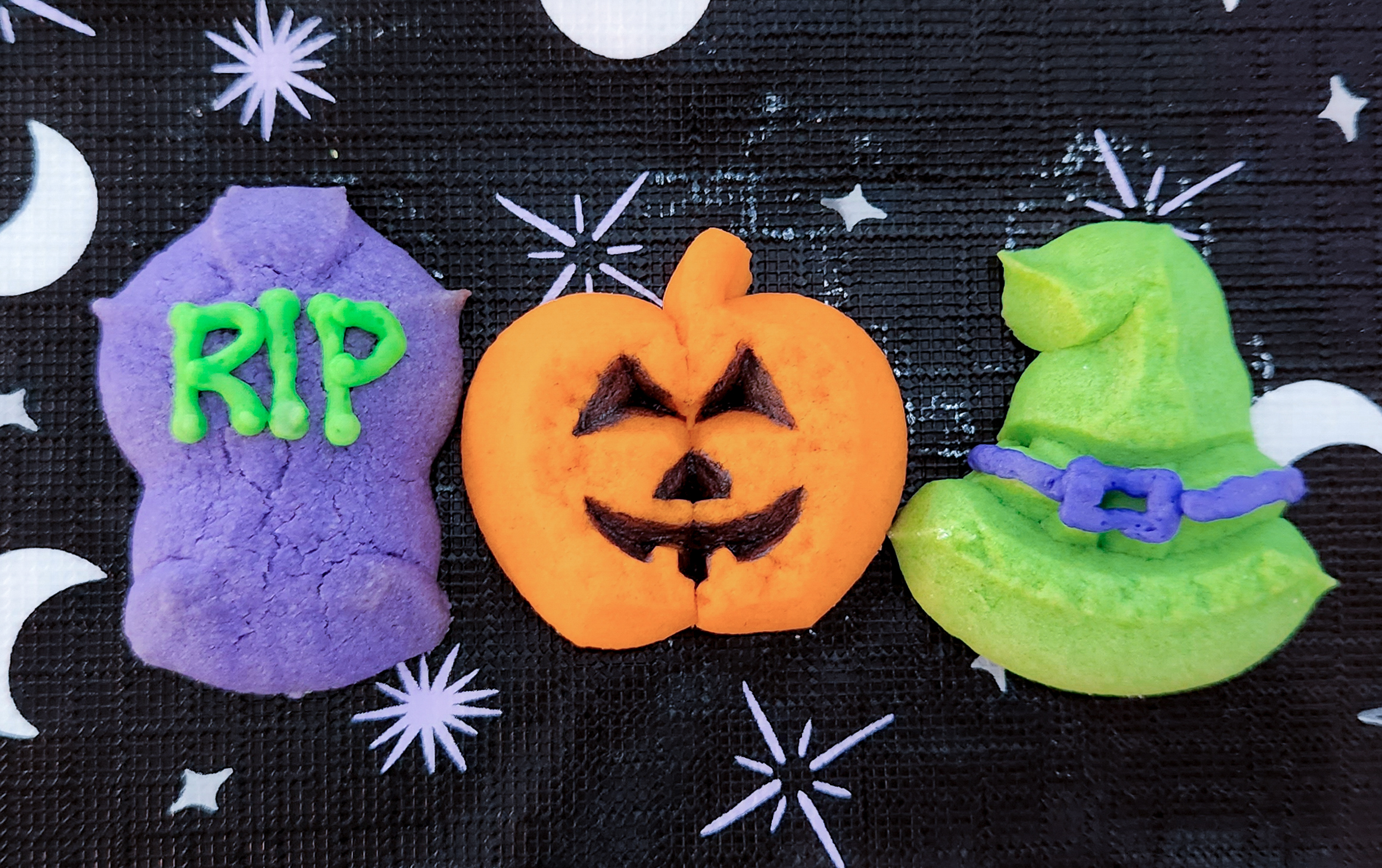 Luster dust is what makes the white cookies look sparkly white, fills in the recesses in the skull and jack-o-lantern, and gives the candy corn its 3 color look. I use it so often in my cookie press posts that in 2022 we started selling it on our website and Etsy shop! We chose to partner with an American company, Bakell, that makes dusts here in the USA. They make gorgeous dusts that are silky, vibrant, and a joy to work with. Their 4 gram jars last and last. A little goes a long way! For this recipe I used Moonstone Black, Classic Orange, Classic Yellow, and Snowflake White.