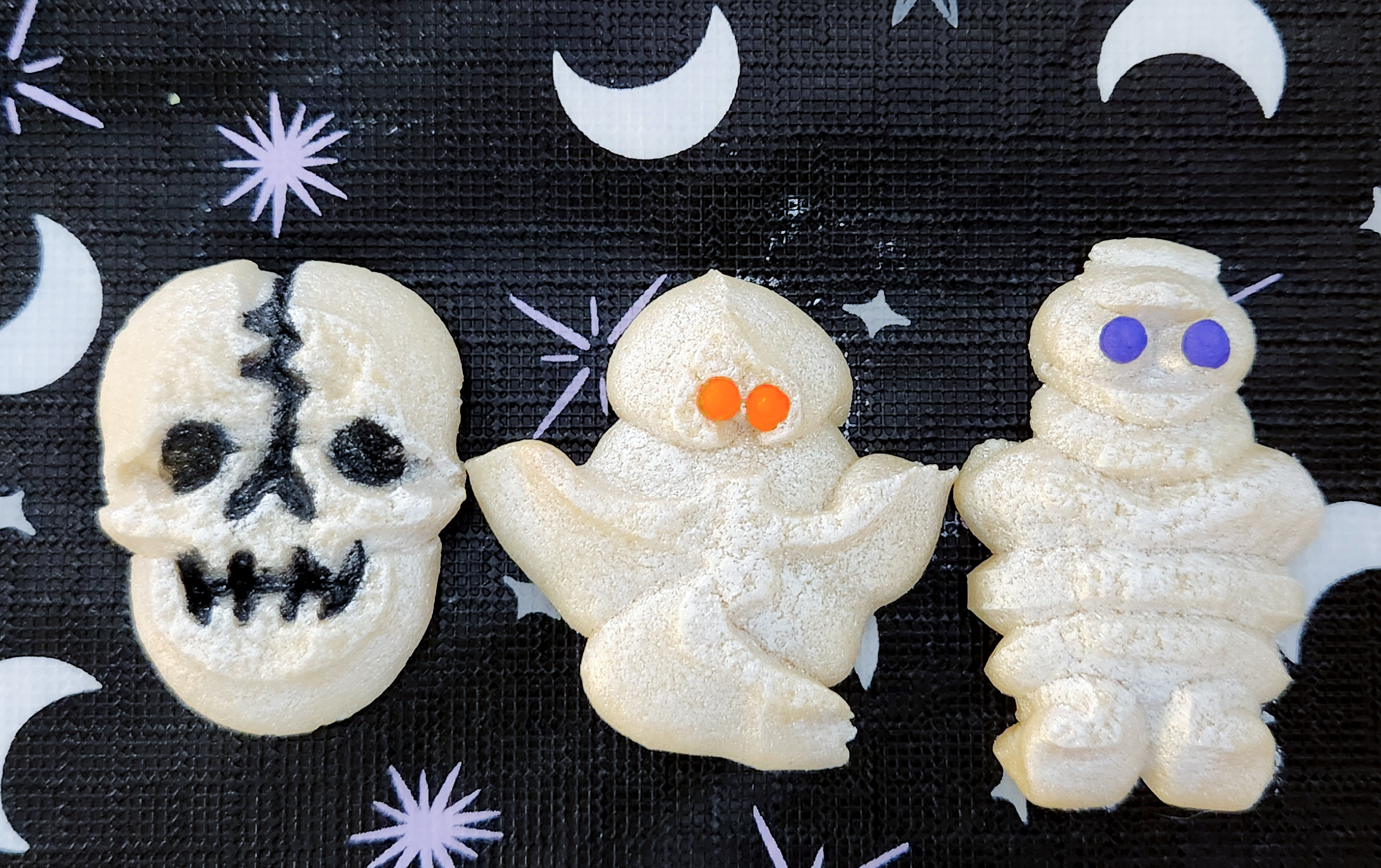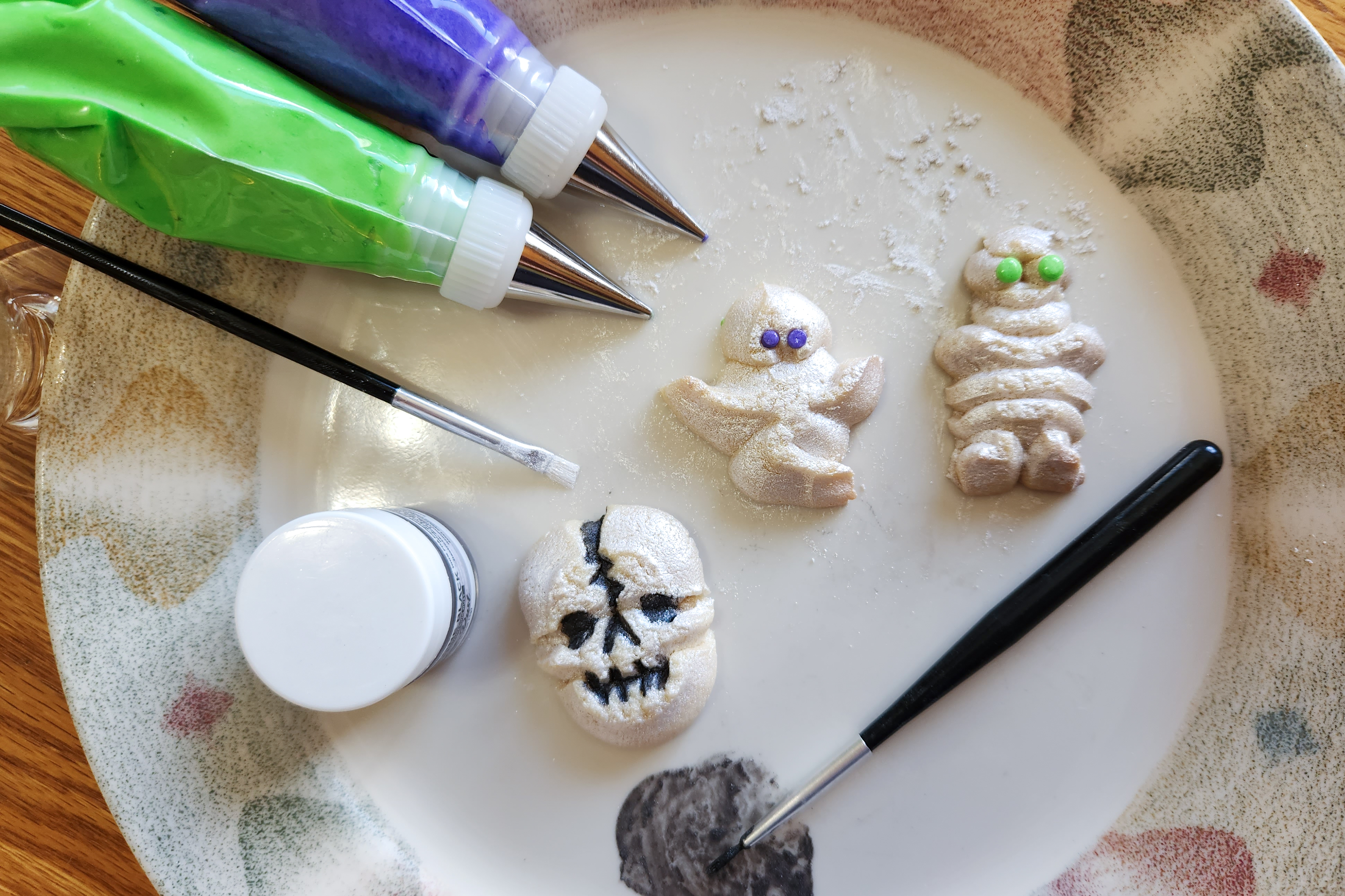Make dots for eyes on the critters and mummies. Use a damp fingertip to gently tap down any points in the icing to make the eyes round.