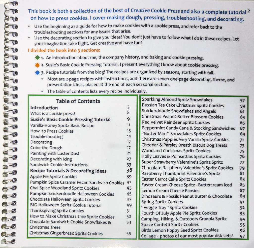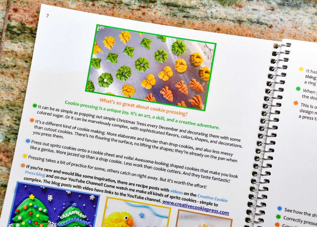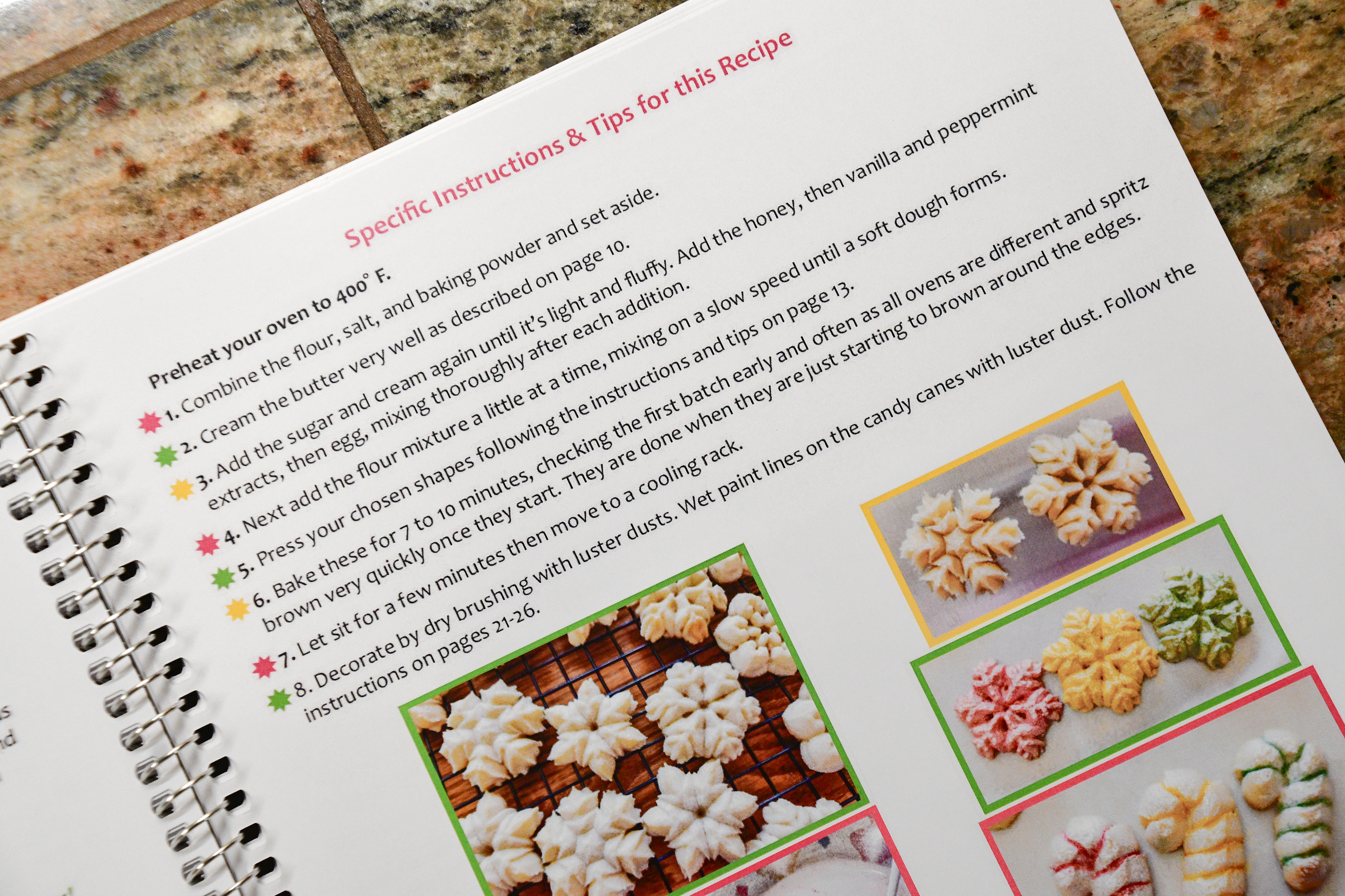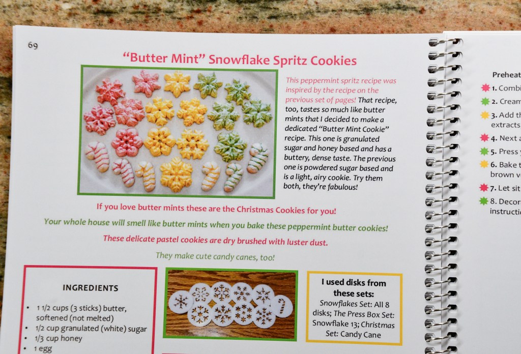 The book is self-published. We are a small company, not a big bakeware empire! I wanted it to be as user-friendly as possible, and I did my best to keep the cost down without sacrificing quality. I kept the price point as low as we could afford. I very intentionally made it a spiral-bound book that lays FLAT on the kitchen counter! The front and back have clear plastic covers to keep the book clean while you bake. The paper is heavy and glossy to withstand all your spritz cookie adventures, which I hope will be many.