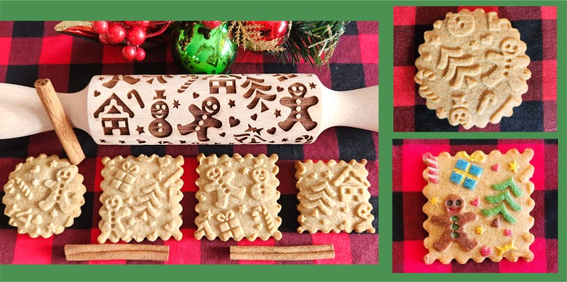 Gingerbread cookies patterned with an embossed rolling pin! Simply darling un-decorated. Bright and eye-catching when painted with luster dust. To paint, use a brush or use your fingers, either way it’s easy and Zen like a coloring book! The shapes are already there, just color them in! This is an easy, fun recipe with full instructions with videos.