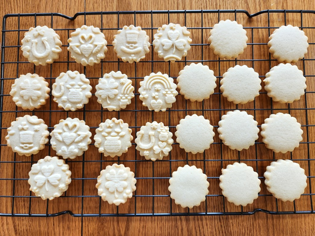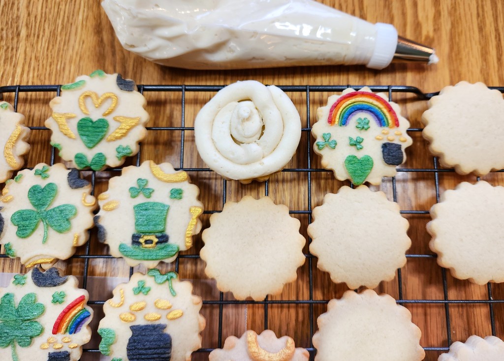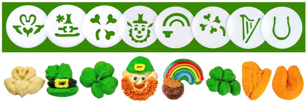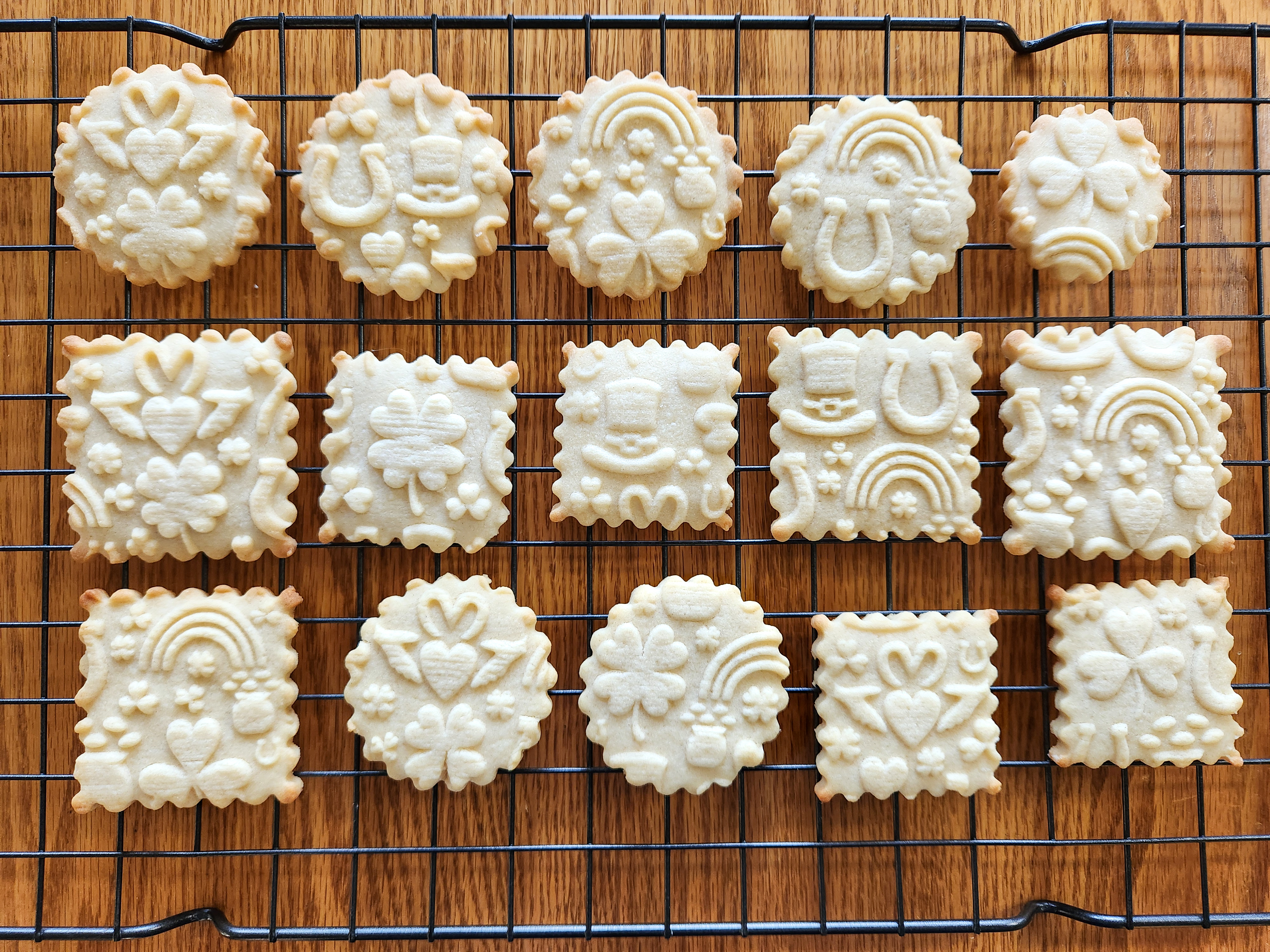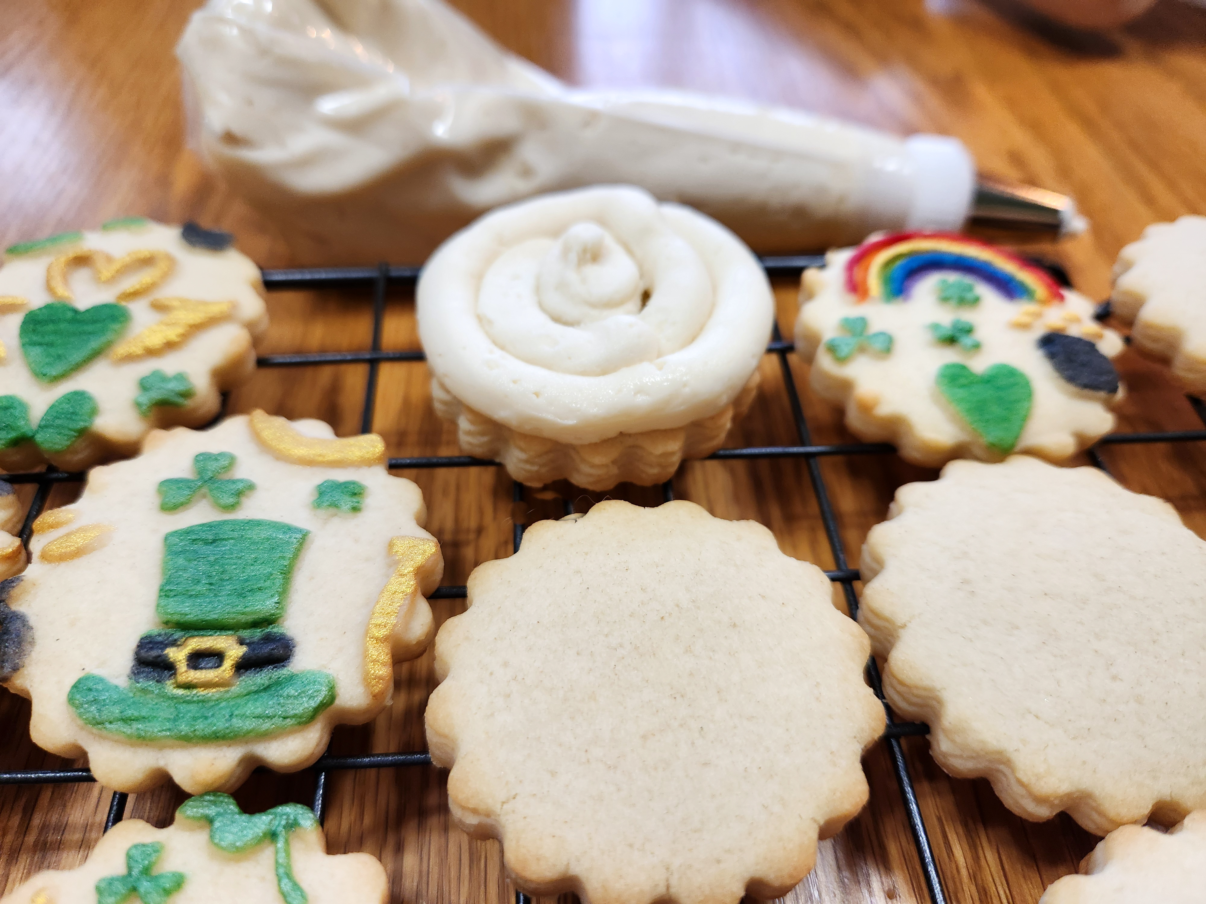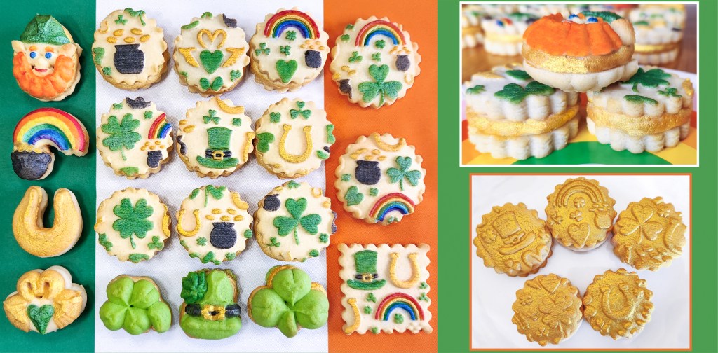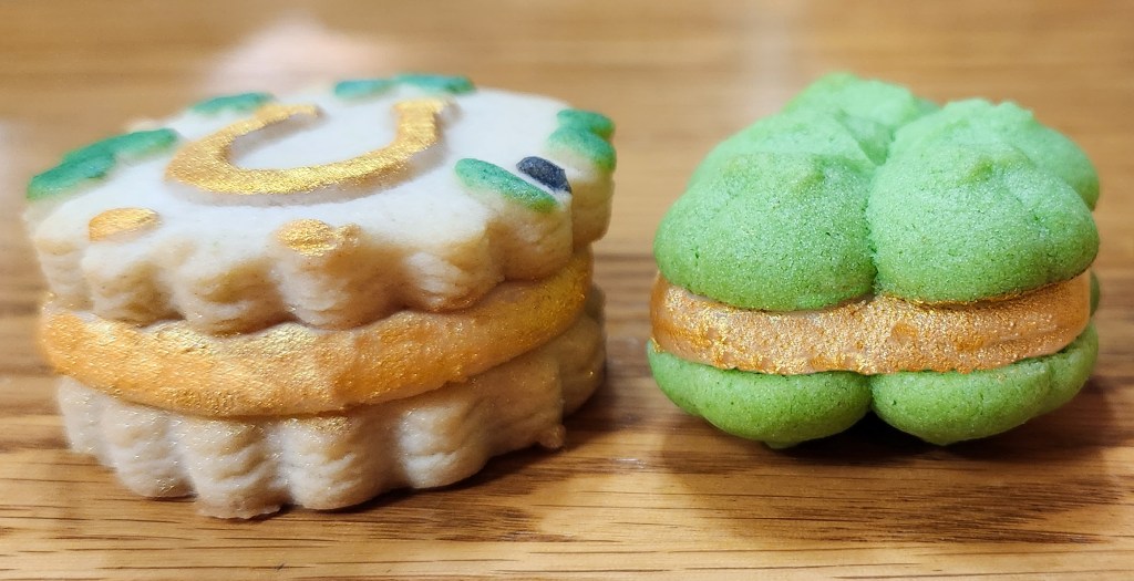 NOTE!!! I have full instructions for cookies with the embossed rolling pin in this post. But for the spritz cookie version (using a cookie press), that recipe has already been posted using some St. Patrick’s shapes, so I’m just going to link that here. I’ll show painting and sandwiching with Baileys buttercream here, but the basic cookie recipe, pressing, and baking instructions are already on the other post. The link: https://creativecookiepress.com/2017/02/24/shamrock-four-leaf-clover-st-patricks-day-cookies/