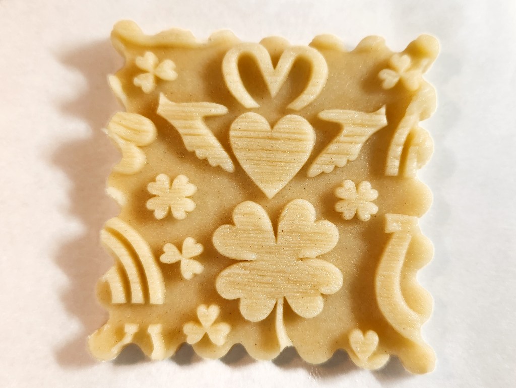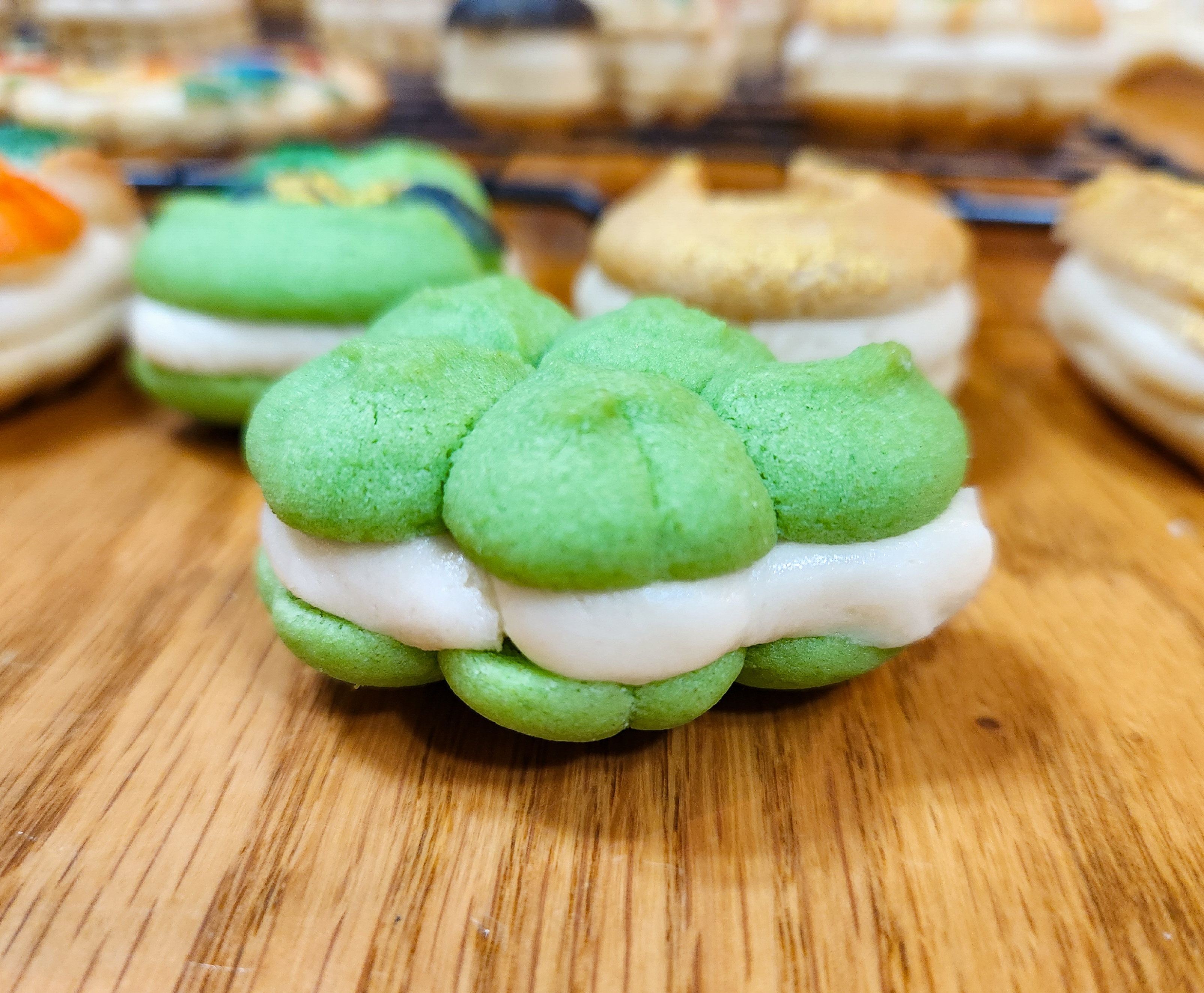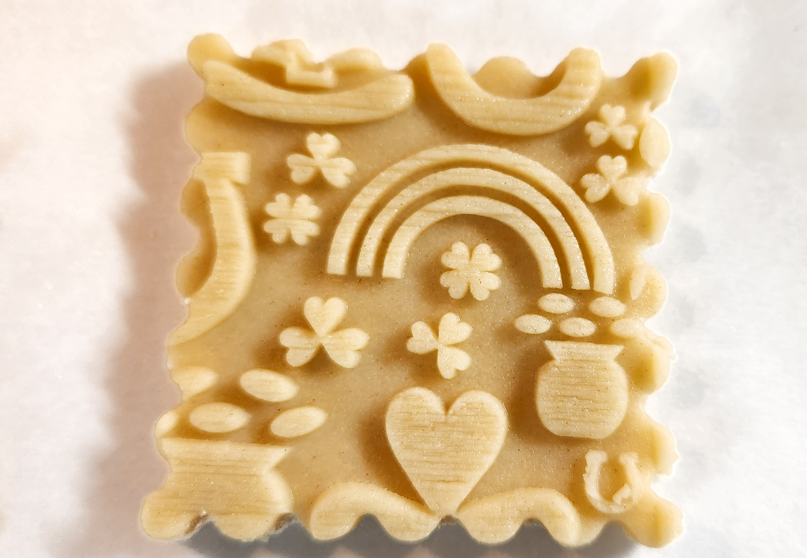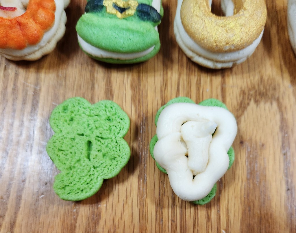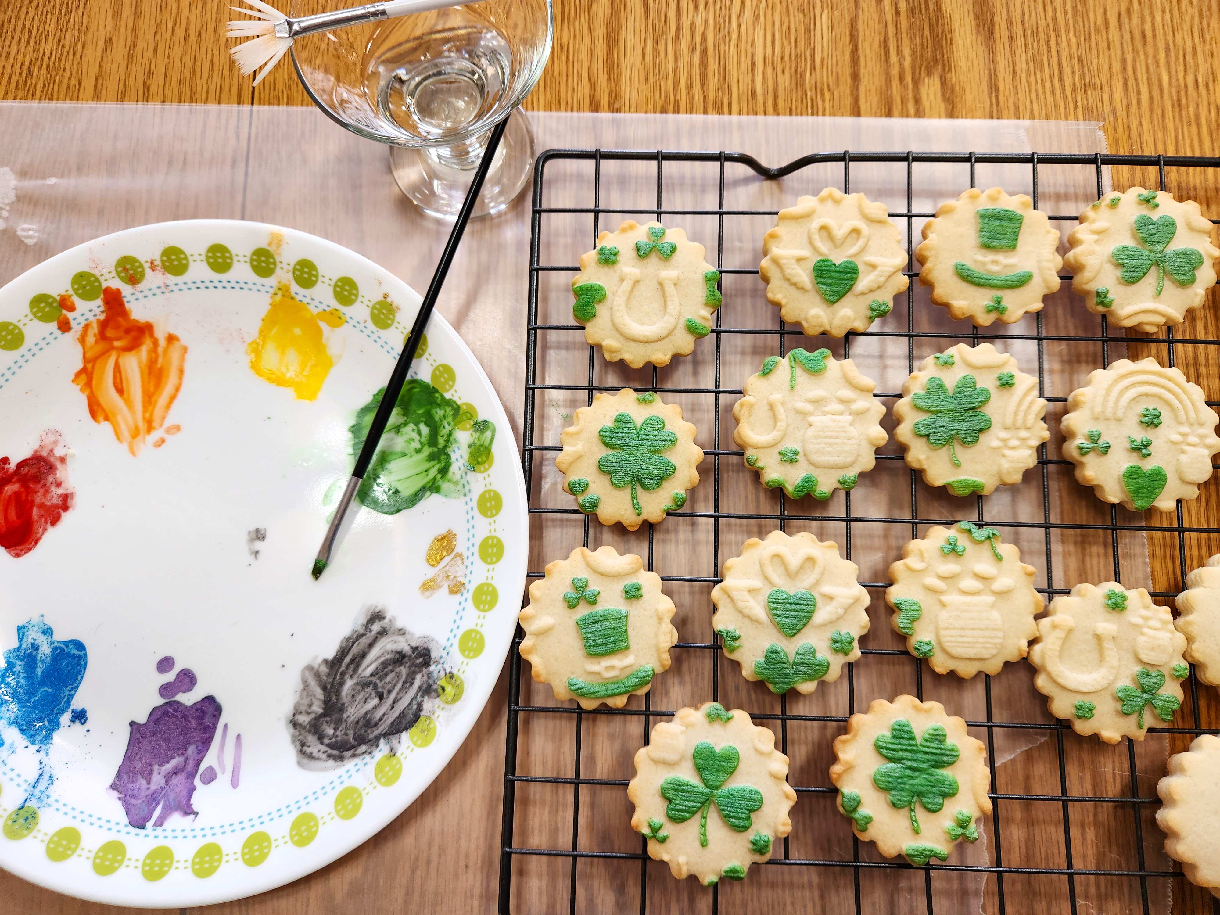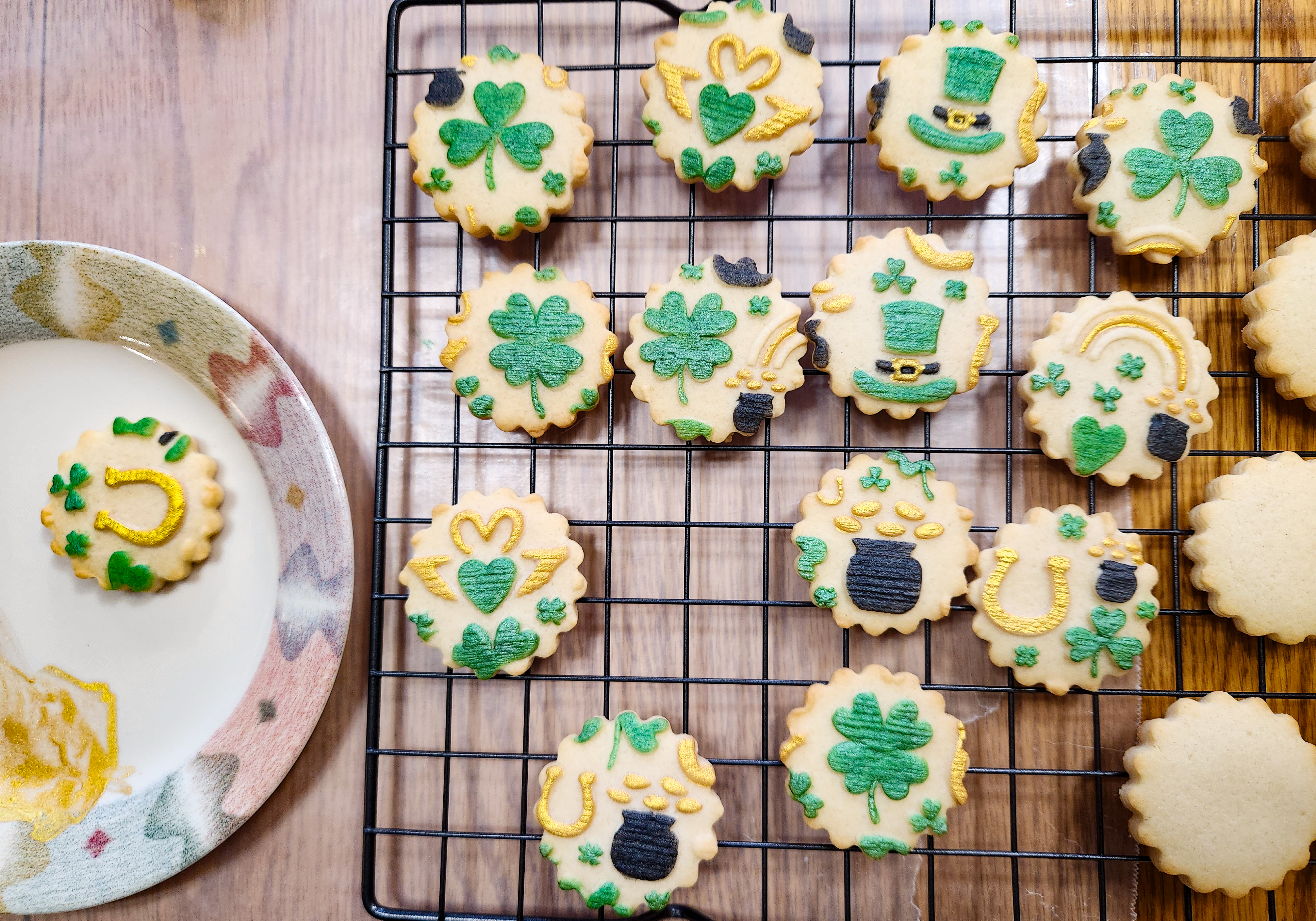 NOTE!!! I have full instructions for cookies with the embossed rolling pin in this post. But for the spritz cookie version (using a cookie press), that recipe has already been posted using some St. Patrick’s shapes, so I’m just going to link that here. I’ll show painting and sandwiching with Baileys buttercream here, but the basic cookie recipe, pressing, and baking instructions are already on the other post. The link: https://creativecookiepress.com/2017/02/24/shamrock-four-leaf-clover-st-patricks-day-cookies/