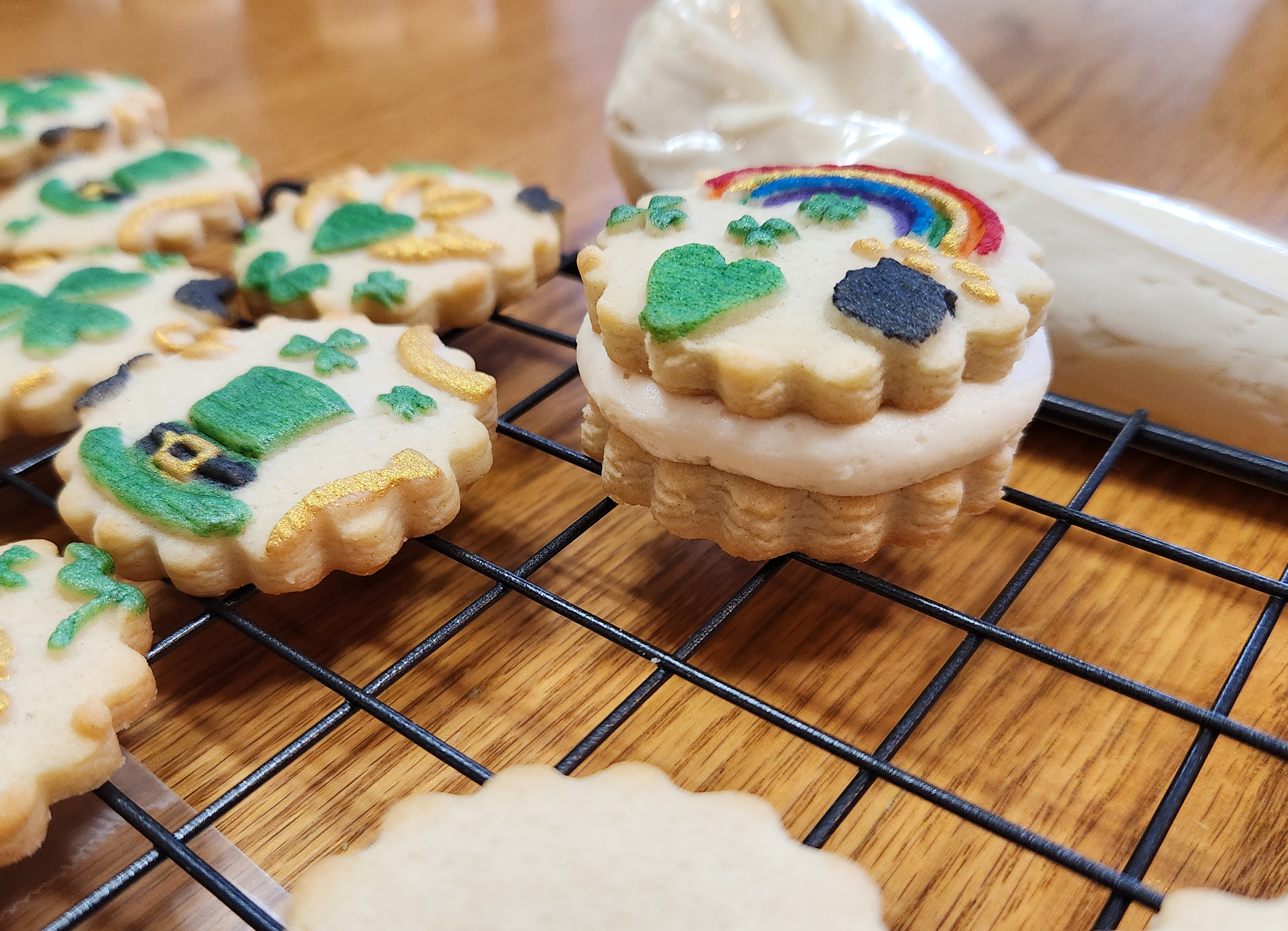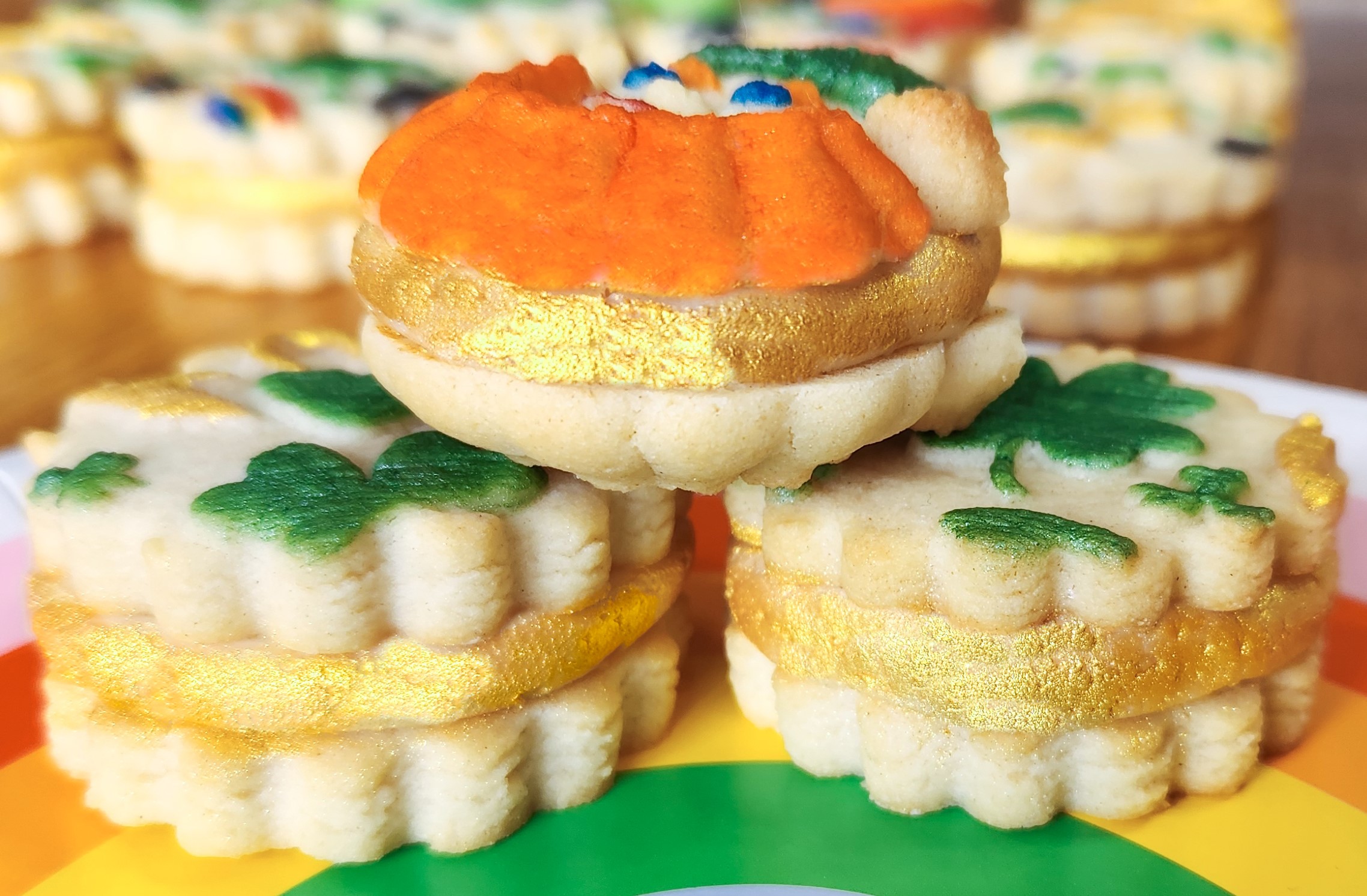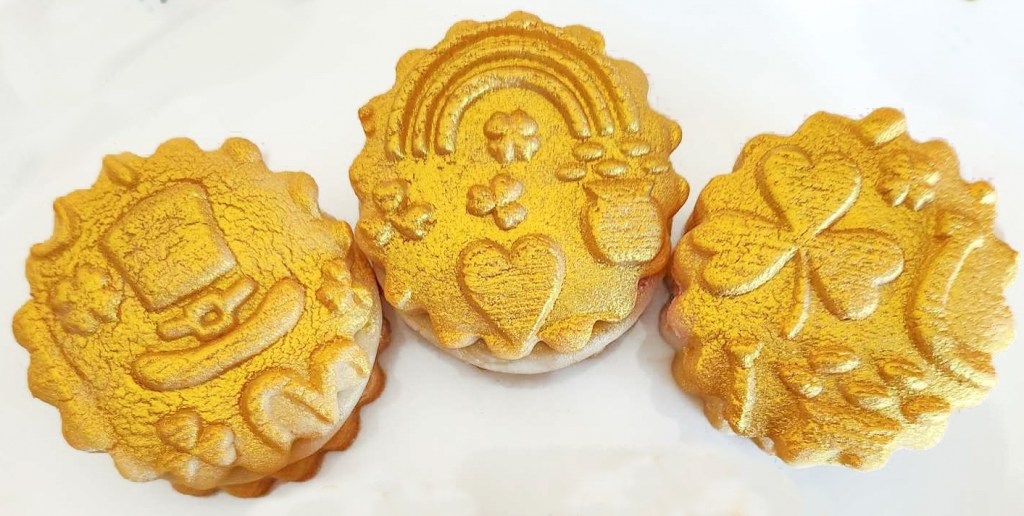 Bake up the Luck O the Irish with boozy St. Patrick’s Day cookies made with Baileys! Use our cookie press disks or embossed rolling pin to make the cookies, then sandwich them with Baileys infused buttercream! This fun festive look is made by painting with edible luster dust. You can also paint the sandwich filling edges gold! There are also a non-alcohol and non-sandwich options.