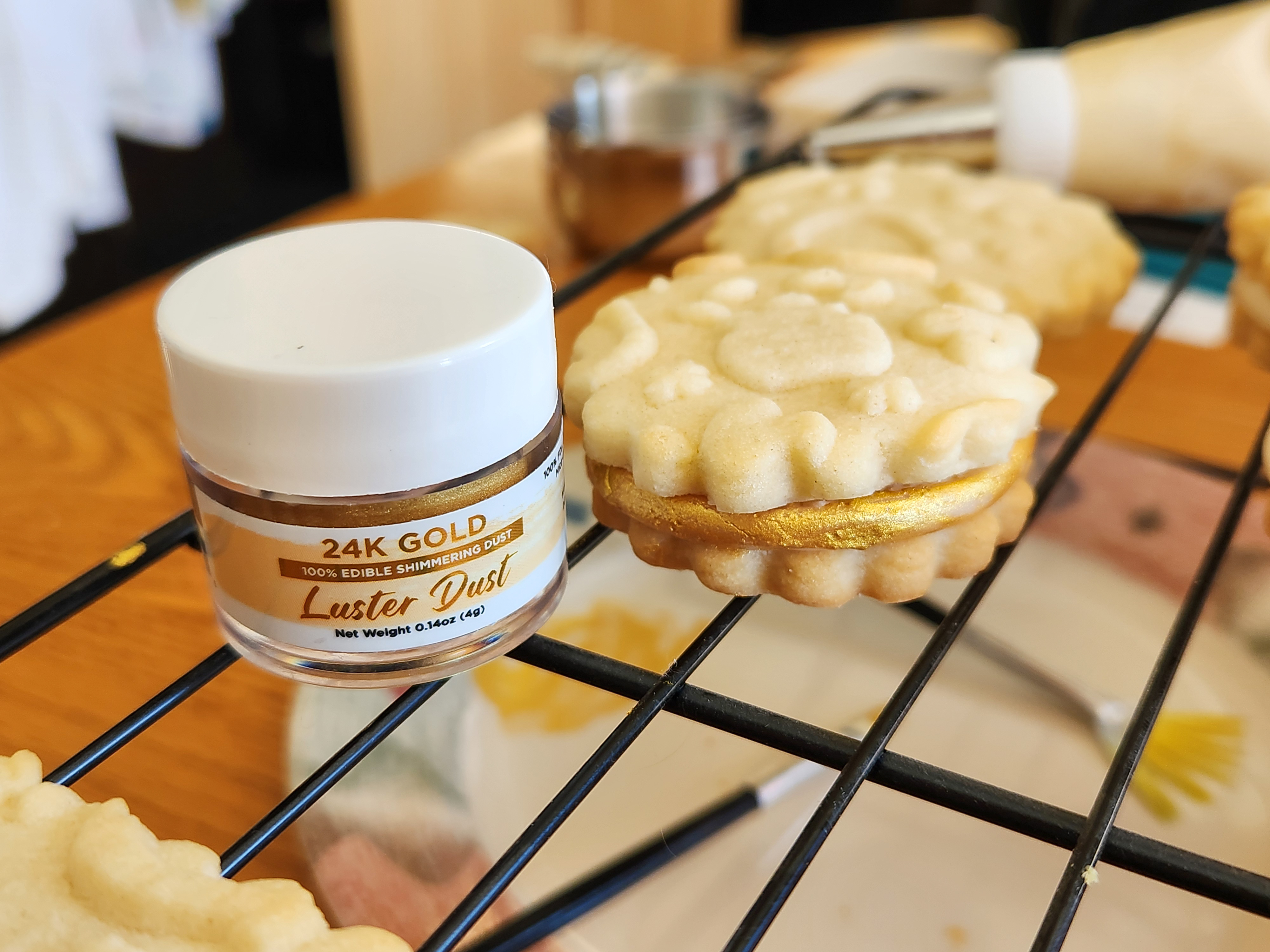 My own last-minute creative idea was to dry brush Bakell’s 14k Gold luster dust on the tops of the embossed cookies. They look like coins! I used a medium sized fan brush, tapped dry dust onto the cookie top, and smeared it all around until it was covered completely. Fabulous!