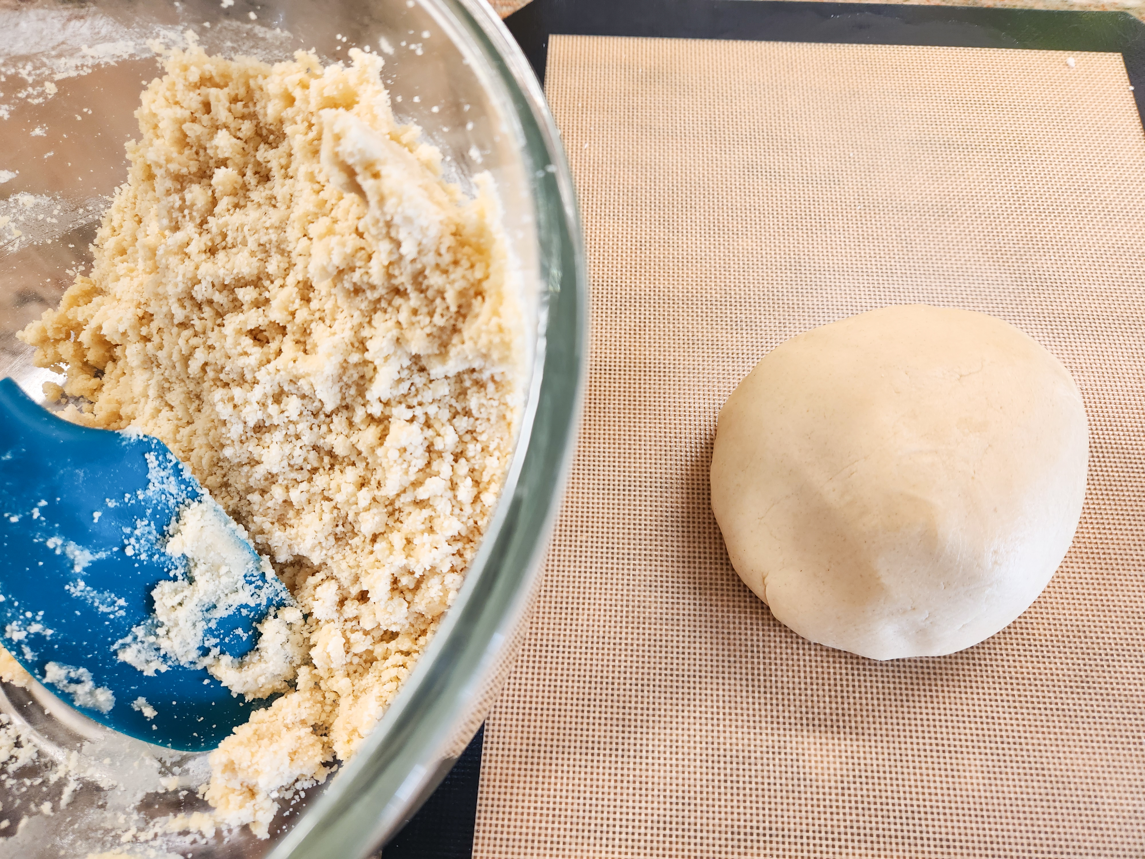 Add the flour mixture slowly, mixing on a slow speed until a workable dough forms. Make sure all of the flour is incorporated evenly. Knead it a bit by hand to make sure it is uniformly smooth and mixed. This dough can seem crumbly at first but it kneads together well. Perfect rolling dough has a clay-like, workable texture that is not too sticky or too stiff. If it feels difficult to knead, it is probably too stiff. Add a little water or vanilla extract a teaspoon at a time until you achieve a workable texture. If it is too easy to knead or is sticking to your fingers, it is probably too soft. Add flour a tablespoon at a time until it is workable like clay.